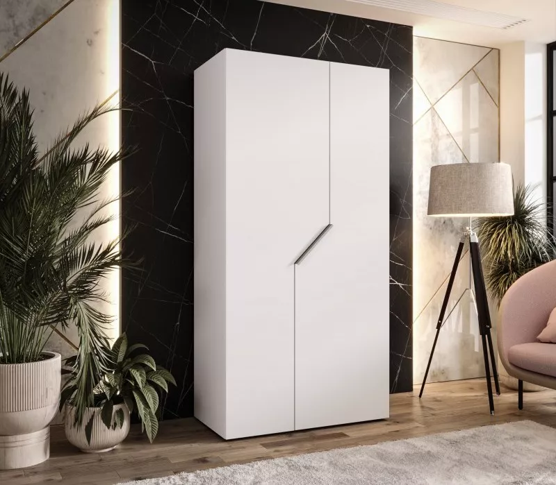 Úzká šatní skříň 100 cm ELIRA 1 zaujme především svým minimalistickým provedením, díky kterému skvěle zapadne do všech stylů ložnic. Skříň disponuje šatní tyčí a horní policí pro uložení bot nebo úložných boxů. Systém tichého dovírání zpříjemní každodenní používání.