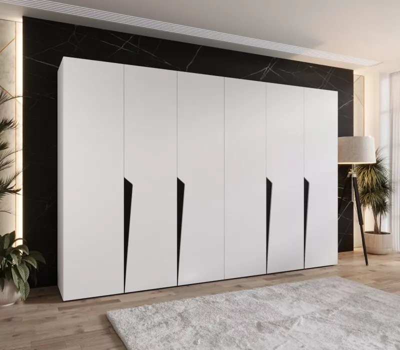 Šestidveřová šatní skříň 300 cm SORAYA 1 - bílá / černé úchyty