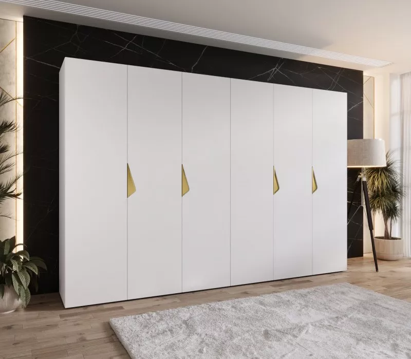 Elegantní šatní skříň 300 cm AMARIS 1 - bílá / zlaté úchyty