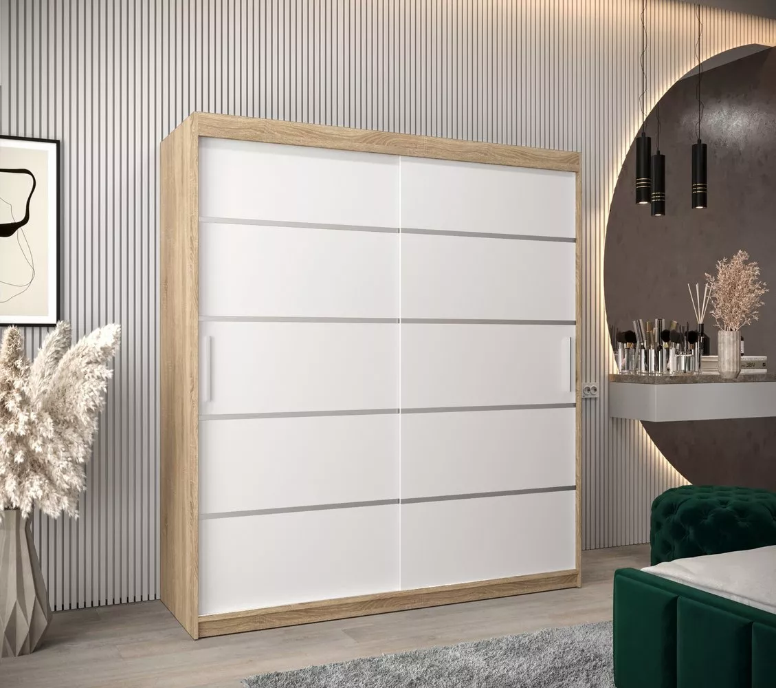 Skříň Enni v moderním stylu se hodí do jakéhokoliv interiéru. Díky jednoduchému vzhledu bude vaše domácnost působit vzdušně a prosvětleně. Díky posuvným dveřím je skříň vhodná i pro menší místností. Skříň je vyrobena z LTD dřevěného materiálu, který je nenáročný na údržbu. Povrchová úprava je matná a přední část je doplněna o ozdobné lišty, díky kterým skříň působí elegantně.