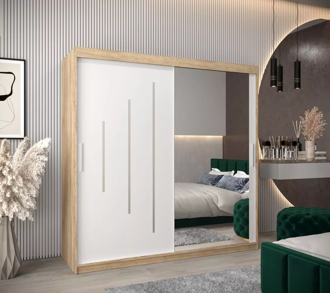 Šatní skříň se zrcadlem HANAH - šířka 200 cm, dub sonoma / bílá