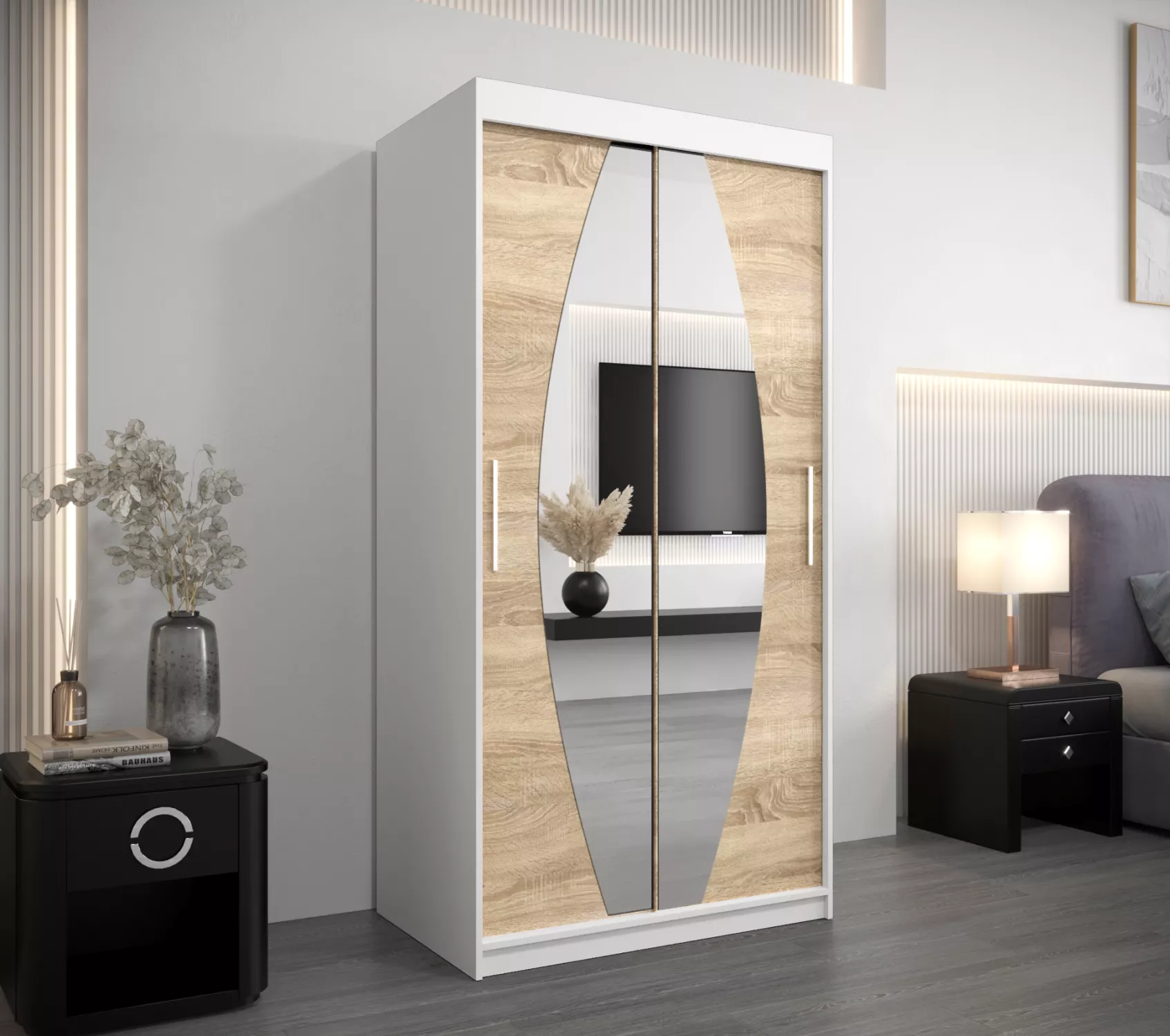 Šatní skříň se zrcadly TAMARA - šířka 100 cm, bílá / dub sonoma