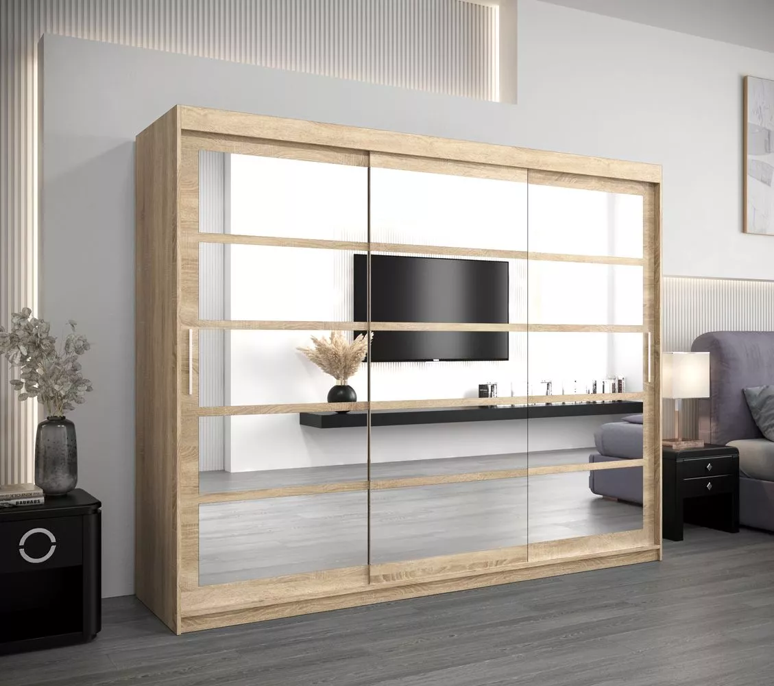 Skříň LEONA v moderním stylu se hodí do jakéhokoliv interiéru. Díky jednoduchému vzhledu bude vaše domácnost působit vzdušně a prosvětleně. Díky posuvným dveřím je skříň vhodná i pro menší místností. Skříň je vyrobena z LTD dřevěného materiálu, který je nenáročný na údržbu. Povrchová úprava je matná a přední část je doplněna praktickými zrcadly.