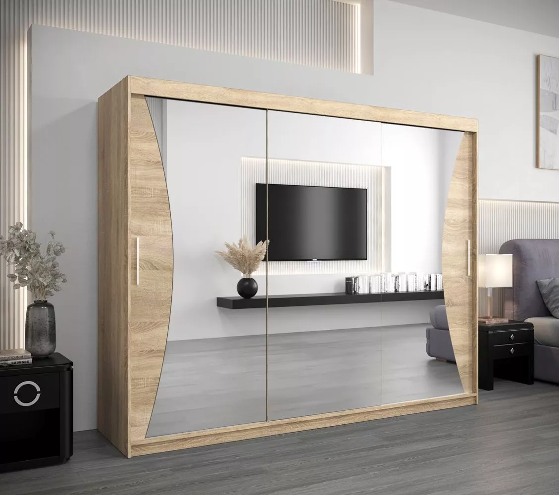 Skříň AJA v moderním stylu se hodí do jakéhokoliv interiéru. Díky jednoduchému vzhledu bude vaše domácnost působit vzdušně a prosvětleně. Díky posuvným dveřím je skříň vhodná i pro menší místností. Skříň je vyrobena z LTD dřevěného materiálu, který je nenáročný na údržbu. Povrchová úprava je matná a přední část je doplněna praktickými zrcadly.