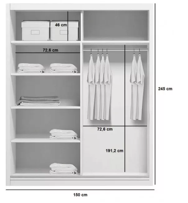 Nadčasová šatní skříň v šířce 150 cm skvěle doplní váš interiér. Kvalitní zpracování LTD potěší i náročné uživatele, praktické posuvné dveře oceníte v boji s nedostatkem místa. Nabídka se vyznačuje nejen moderním designem, ale také stabilní strukturou. Uvnitř skříně jsou police a šatní tyč.