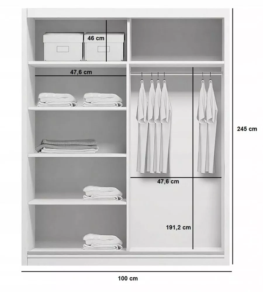 Nadčasová šatní skříň o šířce 100 cm skvěle doplní váš interiér. Kvalitní zpracování LTD potěší i náročné uživatele, praktické posuvné dveře oceníte v boji s nedostatkem místa. Nabídka se vyznačuje nejen moderním designem, ale také stabilní strukturou. Uvnitř skříně jsou police a šatní tyč.