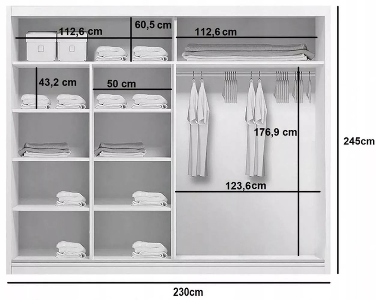Nadčasová šatní skříň v šířce 230 cm skvěle doplní váš interiér. Kvalitní zpracování LTD potěší i náročné uživatele, praktické posuvné dveře oceníte v boji s nedostatkem místa. Nabídka se vyznačuje nejen moderním designem, ale také stabilní strukturou. Uvnitř skříně jsou police a šatní tyč.