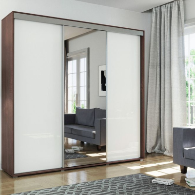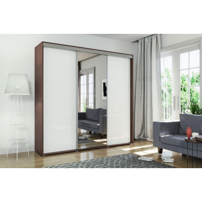 Moderní šatní skříň, která se svým minimalistickým designem hodí do všech typů interiérů. Korpus skříně je vyrobený z velice kvalitní LTD desky. Za třemi posuvnými dveřmi se ukrývá hodně úložného prostoru, který hravě pojme všechno oblečení. Vnitřní část je systematicky uspořádaná do praktických menších oddílů. Po ruce budete mít nejen velké množství polic, ale i tři šatní tyče, na které si můžete zavěsit ramínka s oblečením. Ve středové části se nachází zrcadlo, které dodává skříni luxusnější vzhled. Skříň nemá žádné výrazné úchytky, dveře se otevírají pomocí kovových lišt po stranách.