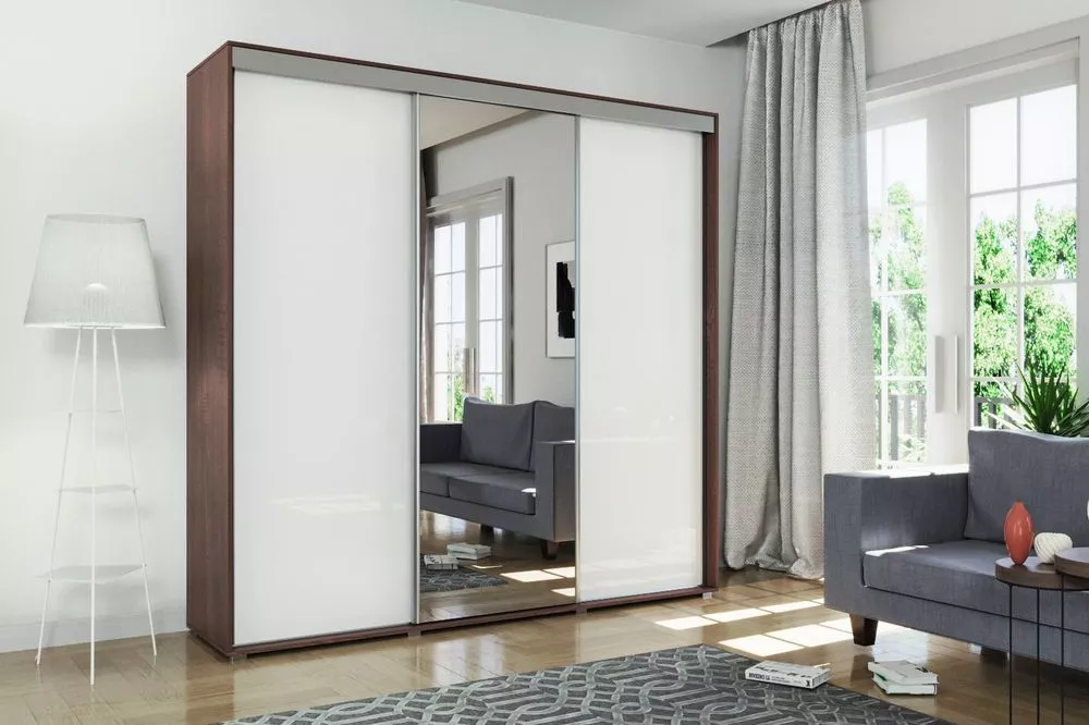 Moderní šatní skříň, která se svým minimalistickým designem hodí do všech typů interiérů. Korpus skříně je vyrobený z velice kvalitní LTD desky. Za třemi posuvnými dveřmi se ukrývá hodně úložného prostoru, který hravě pojme všechno oblečení. Vnitřní část je systematicky uspořádaná do praktických menších oddílů. Po ruce budete mít nejen velké množství polic, ale i tři šatní tyče, na které si můžete zavěsit ramínka s oblečením. Ve středové části se nachází zrcadlo, které dodává skříni luxusnější vzhled. Skříň nemá žádné výrazné úchytky, dveře se otevírají pomocí kovových lišt po stranách.