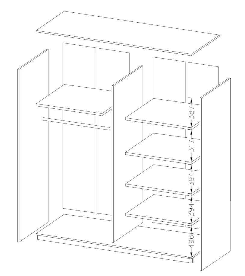 Součástí skříně jsou police i šatní tyč. Systém tichého dovírání k dokoupení naleznete níže.