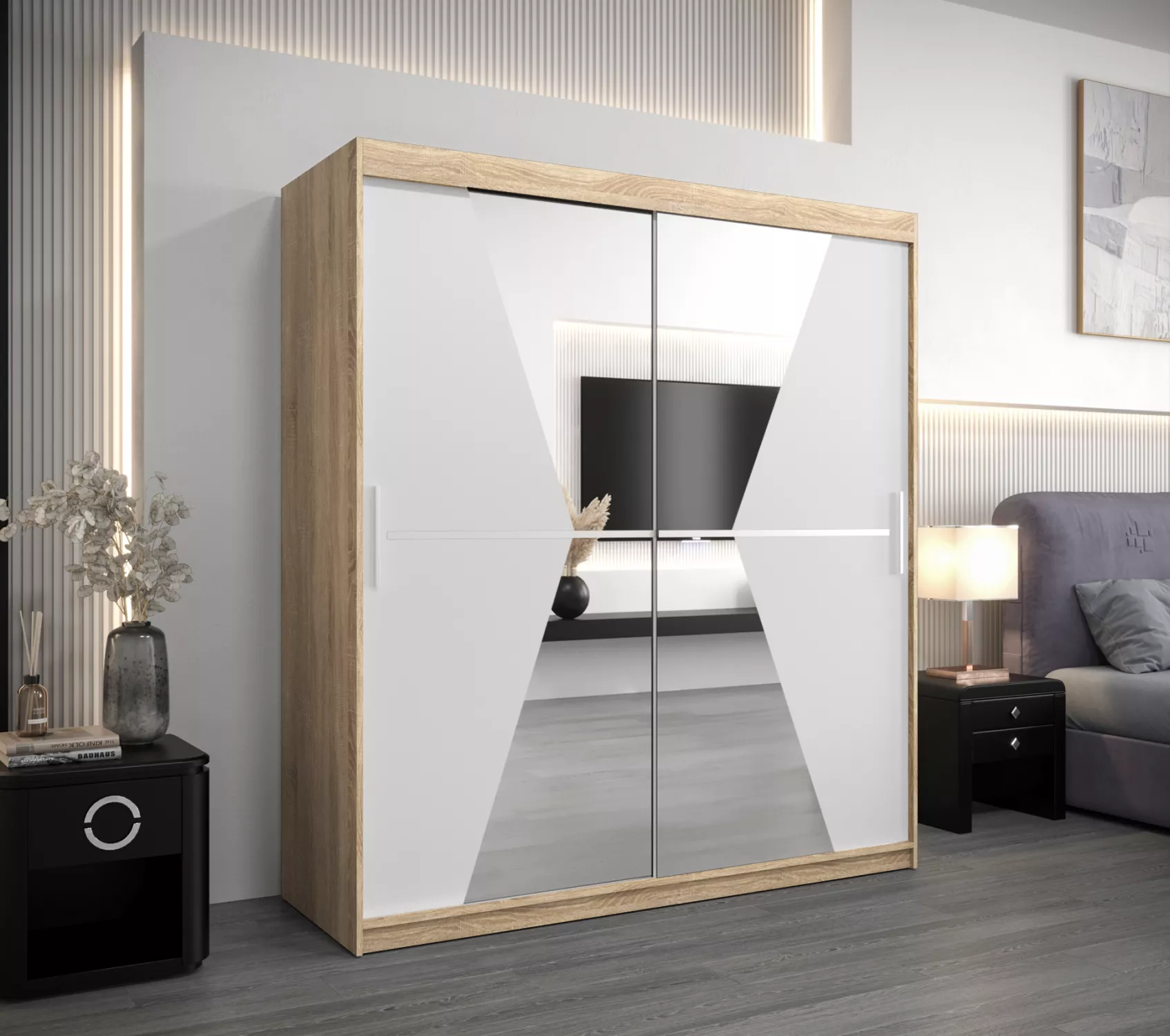 Skříň s posuvnými dveřmi MILANA - šířka 180 cm, dub sonoma / bílá