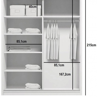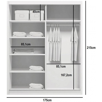Nadčasová šatní skříň v šířce 175 cm skvěle doplní váš interiér. Kvalitní zpracování LTD potěší i náročné uživatele, praktické posuvné dveře oceníte v boji s nedostatkem místa. Nabídka se vyznačuje nejen moderním designem, ale také stabilní strukturou. Uvnitř skříně jsou police a šatní tyč.