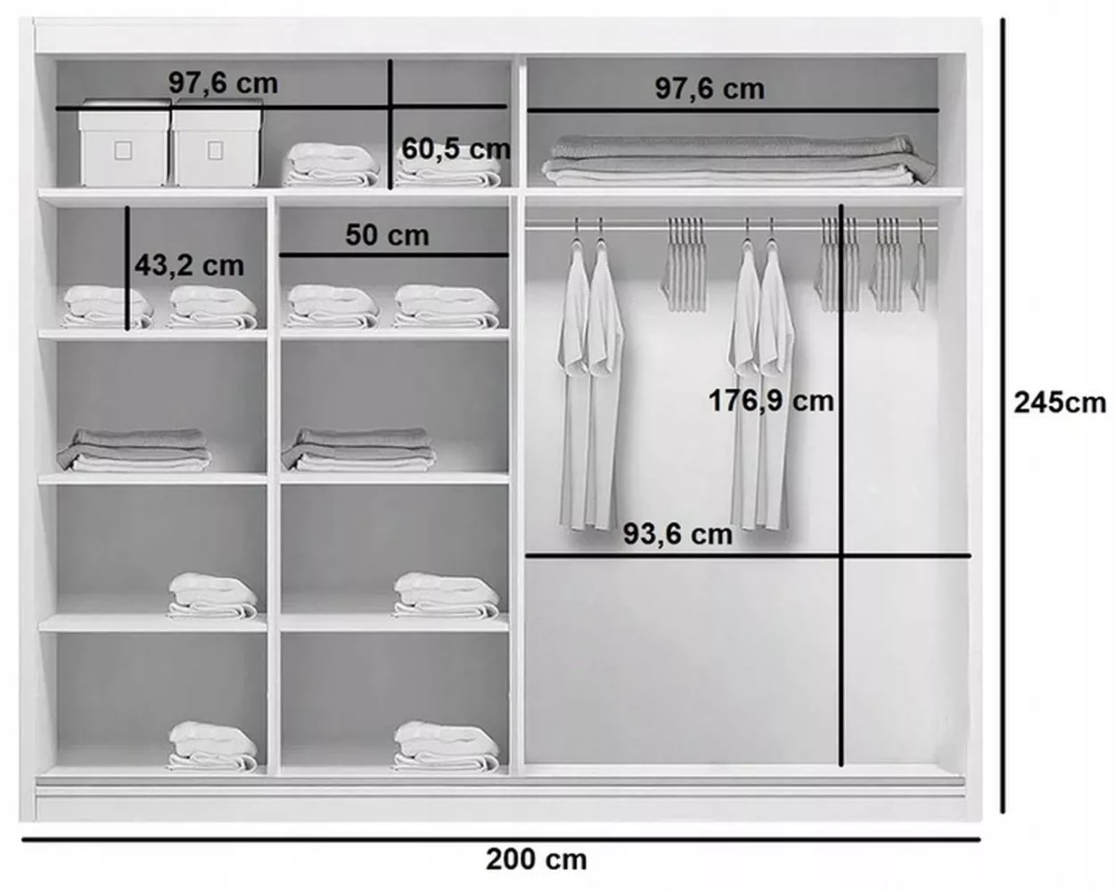 Šatní skříň Fernando představuje kvalitní doplněk do moderní ložnice či předsíně. Kromě jedinečného designu nabízí spoustu místa pro uložení oblečení. Skříň disponuje posuvnými dveřmi na kvalitních hliníkových vodících lištách, otevírání dveří je tak hladké a plynulé. Skříň nemá žádné výrazné úchytky, dveře se otevírají pomocí lišt po stranách. Uvnitř skříně jsou police a šatní tyč.