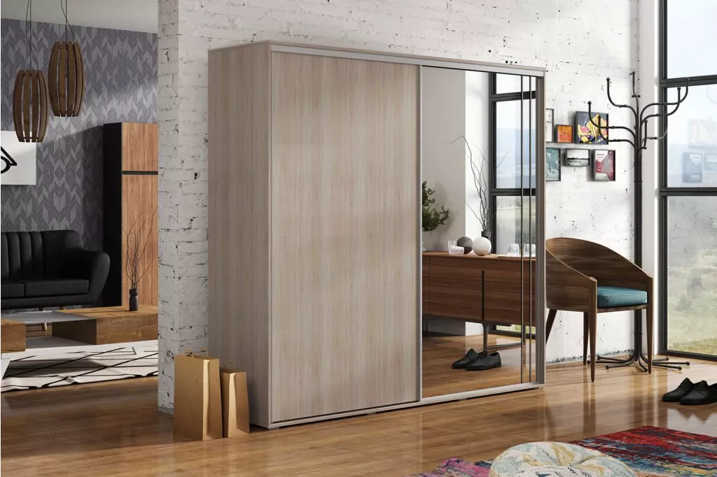 Šatní skříň Hugo představuje kvalitní doplněk do moderní ložnice či předsíně. Kromě jedinečného designu nabízí spoustu místa pro uložení oblečení. Skříň disponuje posuvnými dveřmi na kvalitních hliníkových vodících lištách, otevírání dveří je tak hladké a plynulé. Skříň nemá žádné výrazné úchytky, dveře se otevírají pomocí lišt po stranách. Uvnitř skříně jsou police a šatní tyč.