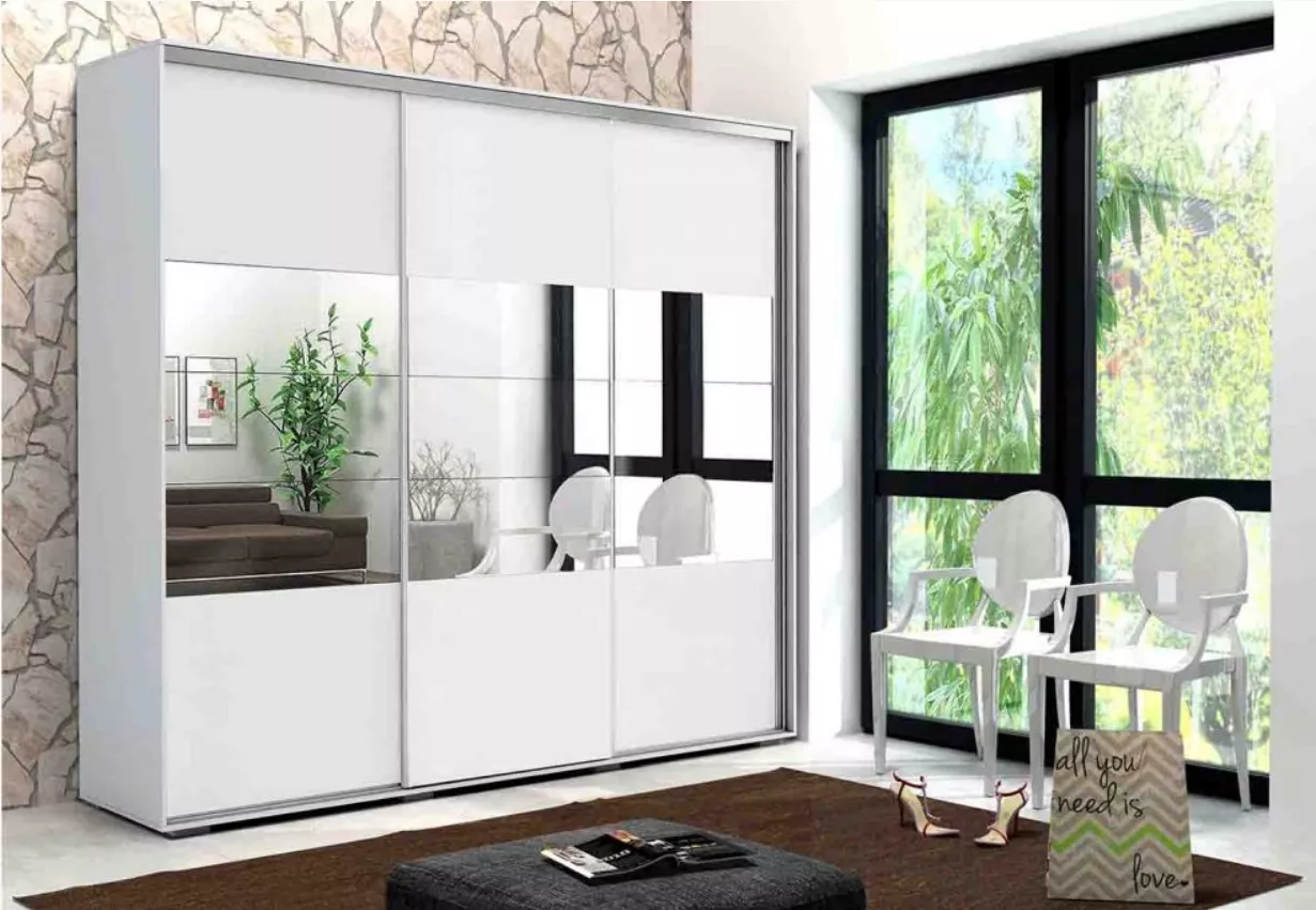 Moderní šatní skříň, která se svým minimalistickým designem hodí do všech typů interiérů. Korpus skříně je vyrobený z velice kvalitní LTD desky. Za třemi posuvnými dveřmi se ukrývá hodně úložného prostoru, který hravě pojme všechno oblečení. Vnitřní část je systematicky uspořádaná do praktických menších oddílů. Po ruce budete mít nejen velké množství polic, ale i tři šatní tyče, na které si můžete zavěsit ramínka s oblečením. Ve středové části se nachází velké zrcadlo, které dodává skříni luxusnější vzhled. Skříň nemá žádné výrazné úchytky, dveře se otevírají pomocí kovových lišt po stranách.