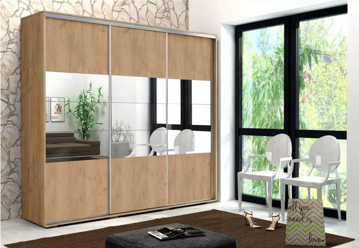 Moderní šatní skříň, která se svým minimalistickým designem hodí do všech typů interiérů. Korpus skříně je vyrobený z velice kvalitní LTD desky. Za třemi posuvnými dveřmi se ukrývá hodně úložného prostoru, který hravě pojme všechno oblečení. Vnitřní část je systematicky uspořádaná do praktických menších oddílů. Po ruce budete mít nejen velké množství polic, ale i tři šatní tyče, na které si můžete zavěsit ramínka s oblečením. Ve středové části se nachází velké zrcadlo, které dodává skříni luxusnější vzhled. Skříň nemá žádné výrazné úchytky, dveře se otevírají pomocí kovových lišt po stranách.