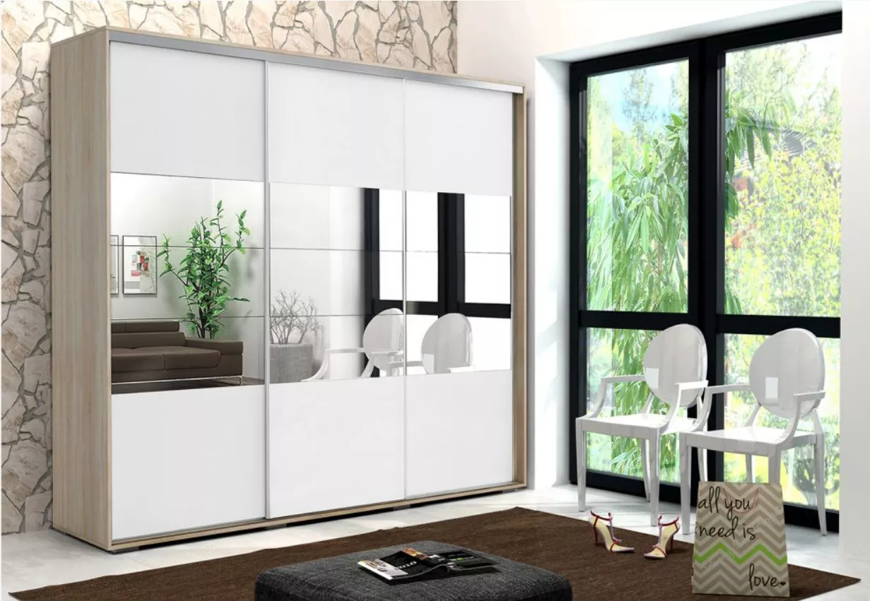 Moderní šatní skříň, která se svým minimalistickým designem hodí do všech typů interiérů. Korpus skříně je vyrobený z velice kvalitní LTD desky. Za třemi posuvnými dveřmi se ukrývá hodně úložného prostoru, který hravě pojme všechno oblečení. Vnitřní část je systematicky uspořádaná do praktických menších oddílů. Po ruce budete mít nejen velké množství polic, ale i tři šatní tyče, na které si můžete zavěsit ramínka s oblečením. Ve středové části se nachází velké zrcadlo, které dodává skříni luxusnější vzhled. Skříň nemá žádné výrazné úchytky, dveře se otevírají pomocí kovových lišt po stranách.