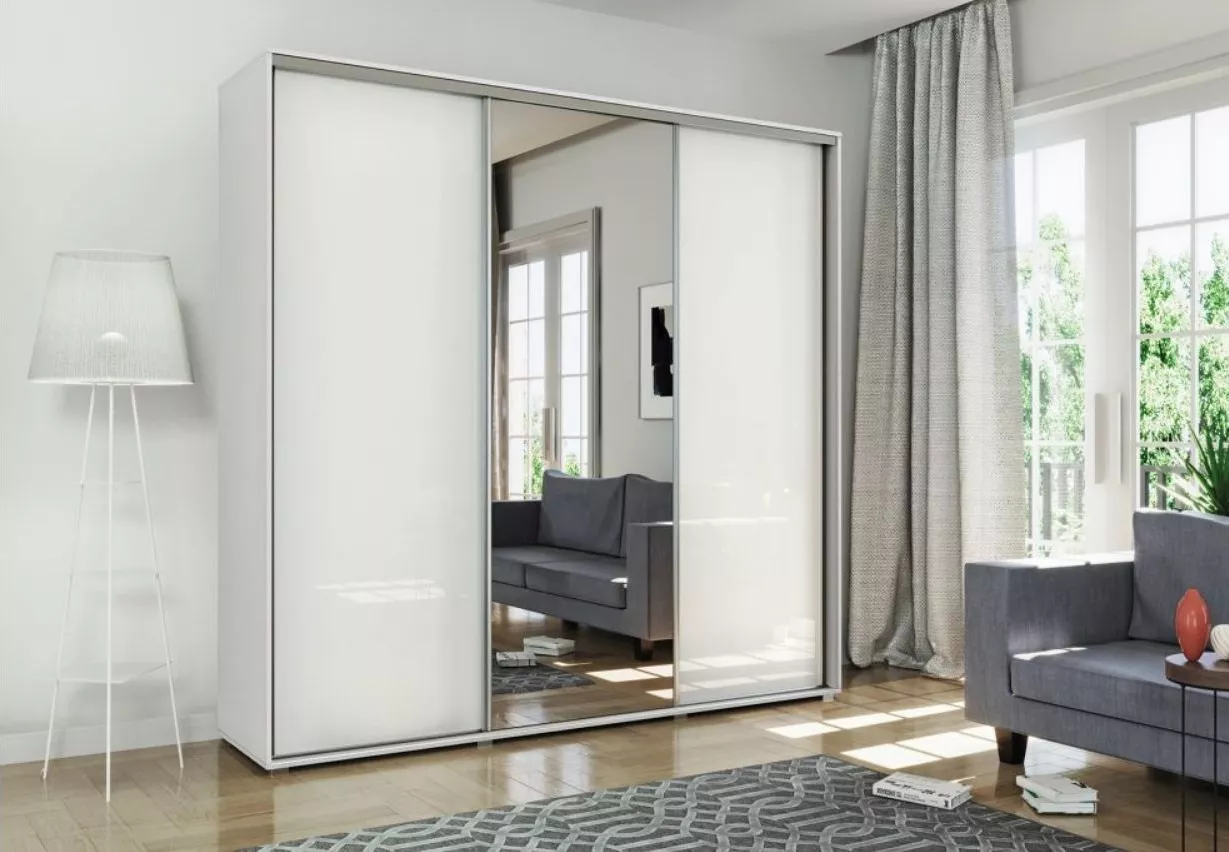 Moderní šatní skříň, která se svým minimalistickým designem hodí do všech typů interiérů. Korpus skříně je vyrobený z velice kvalitní LTD desky. Za třemi posuvnými dveřmi se ukrývá hodně úložného prostoru, který hravě pojme všechno oblečení. Vnitřní část je systematicky uspořádaná do praktických menších oddílů. Po ruce budete mít nejen velké množství polic, ale i tři šatní tyče, na které si můžete zavěsit ramínka s oblečením. Ve středové části se nachází zrcadlo, které dodává skříni luxusnější vzhled. Skříň nemá žádné výrazné úchytky, dveře se otevírají pomocí kovových lišt po stranách.