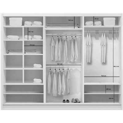 Moderní šatní skříň, která se svým minimalistickým designem hodí do všech typů interiérů. Korpus skříně je vyrobený z velice kvalitní LTD desky. Za třemi posuvnými dveřmi se ukrývá hodně úložného prostoru, který hravě pojme všechno oblečení. Vnitřní část je systematicky uspořádaná do praktických menších oddílů. Po ruce budete mít nejen velké množství polic, ale i tři šatní tyče, na které si můžete zavěsit ramínka s oblečením. Skříň nemá žádné výrazné úchytky, dveře se otevírají pomocí kovových lišt po stranách.