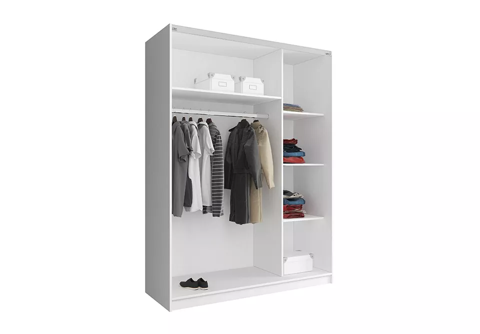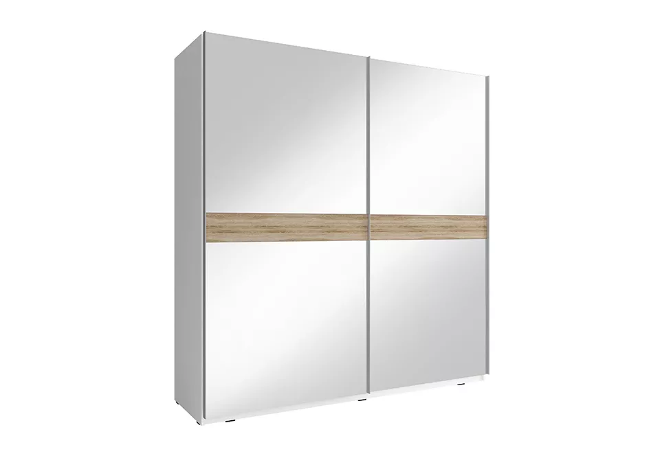 Šatní skříň nabízí velkorysý úložný prostor pro vaše oblečení. Díky vnitřnímu uspořádání budete moci vše uložit tak, aby každý kus oděvu měl své místo a vy jej v případě potřeby snadno našli. Zrcadlo umístěné na posuvných dveřích vám prosvětlí interiér a opticky zvětší prostor.