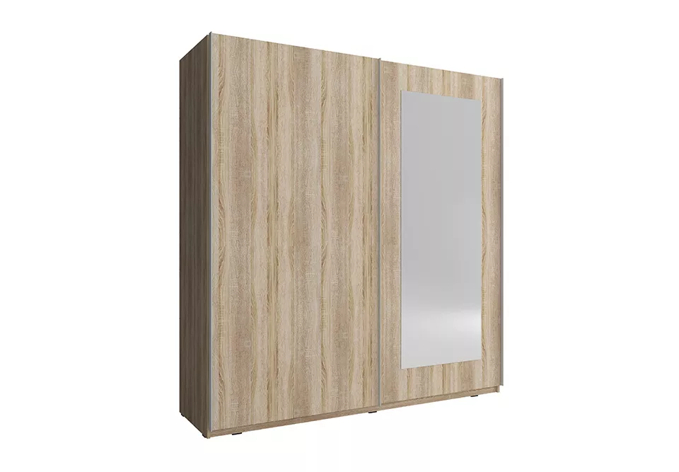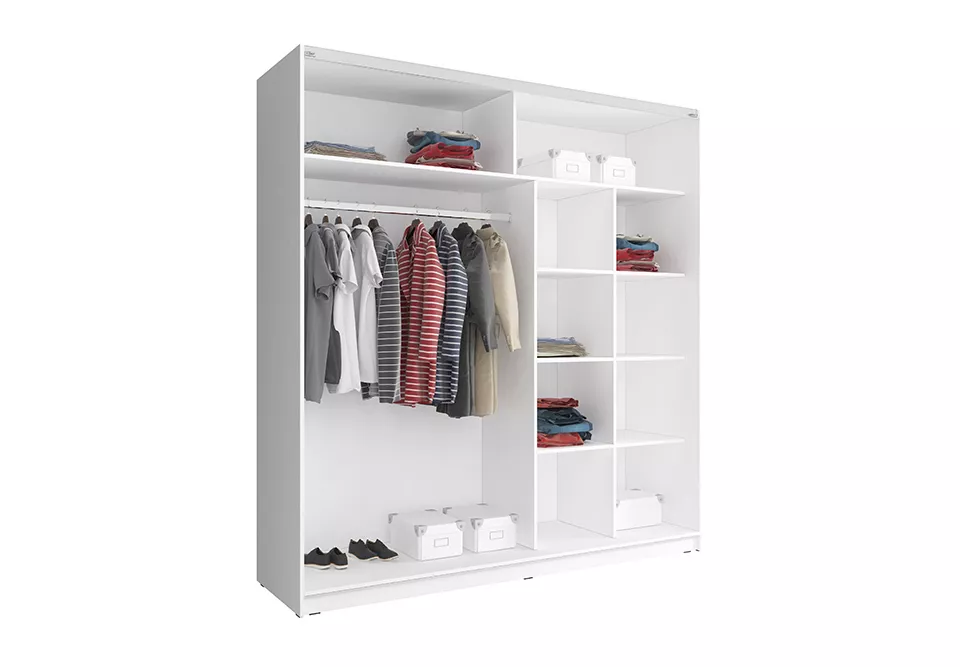 Šatní skříň nabízí velkorysý úložný prostor pro vaše oblečení. Díky vnitřnímu uspořádání budete moci vše uložit tak, aby každý kus oděvu měl své místo a vy jej v případě potřeby snadno našli. Zrcadlo umístěné na posuvných dveřích vám prosvětlí interiér a opticky zvětší prostor.