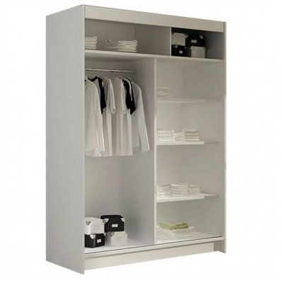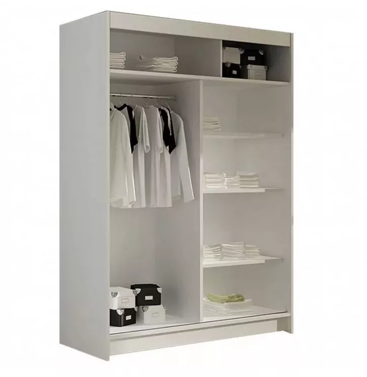 Kombinovaná šatní skříň s posuvnými dveřmi se hodí do každého moderního interiéru. Vnitřní uspořádání je tvořeno hlubokými policemi a šatní tyčí, které umožňují snadné oddělení každodenních věcí. Skříň je vybavena praktickým barevným RGB LED osvětlením, které vám usnadní hledání vašeho perfektního kousku oblečení.