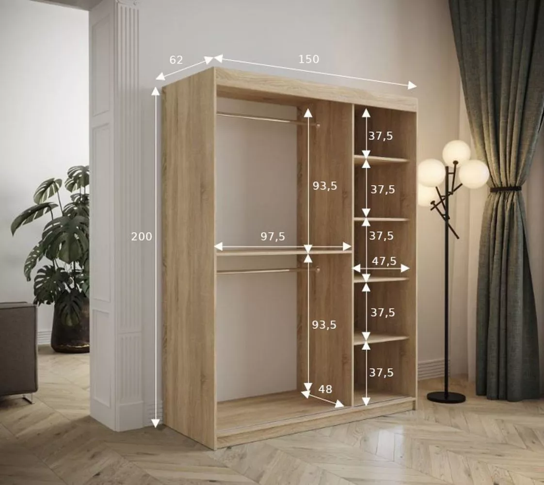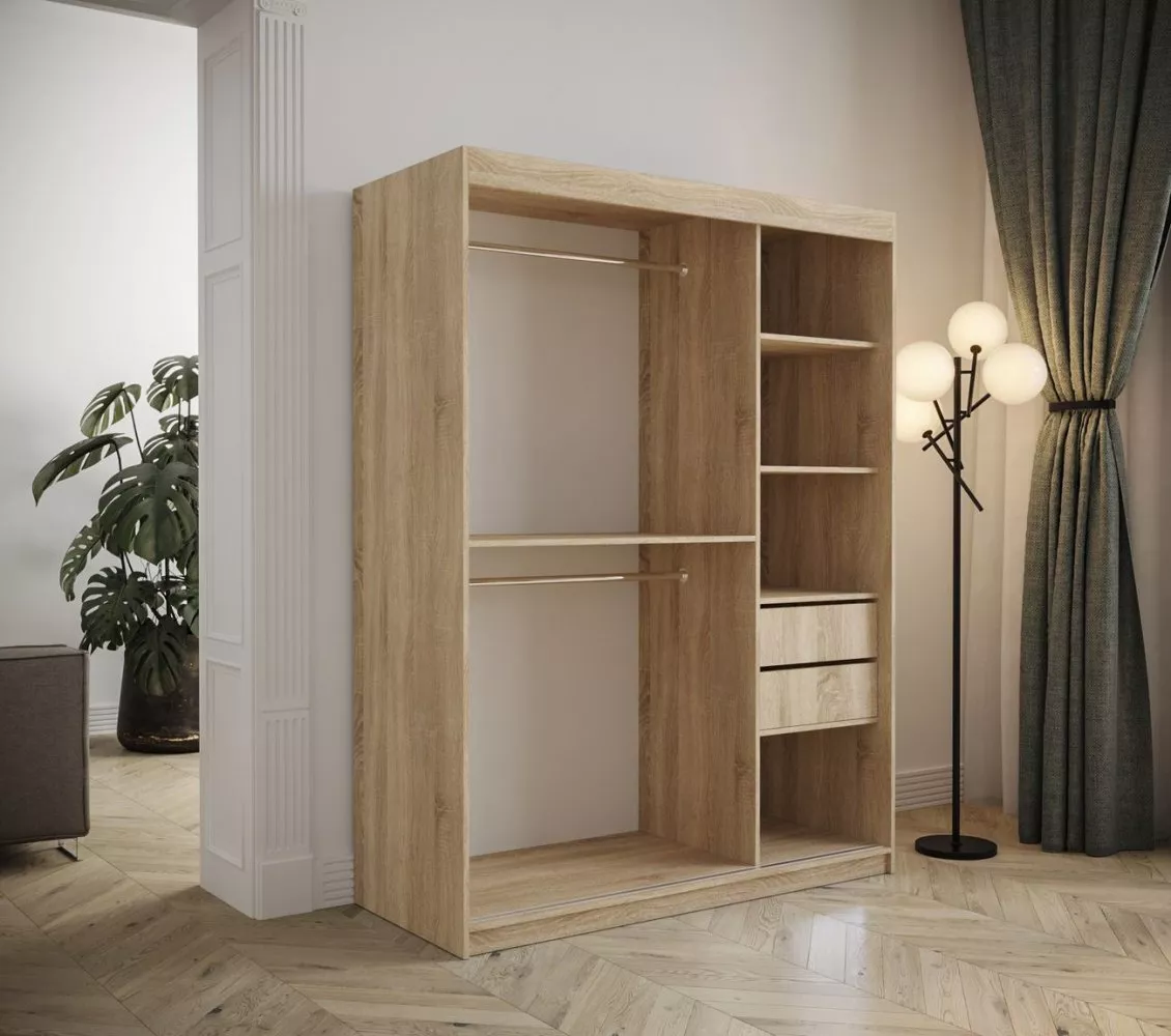 Šatní skříň Talia je vyrobena z LTD nábytkové desky o síle 16 mm, hrany jsou pečlivě zakončeny trvanlivou a odolnou PVC dýhou. Šatní skříň používá posuvné dveře na kolejničkách "BIMAK". Ke skříni si navíc můžete zakoupit šuplíky, které naleznete níže.