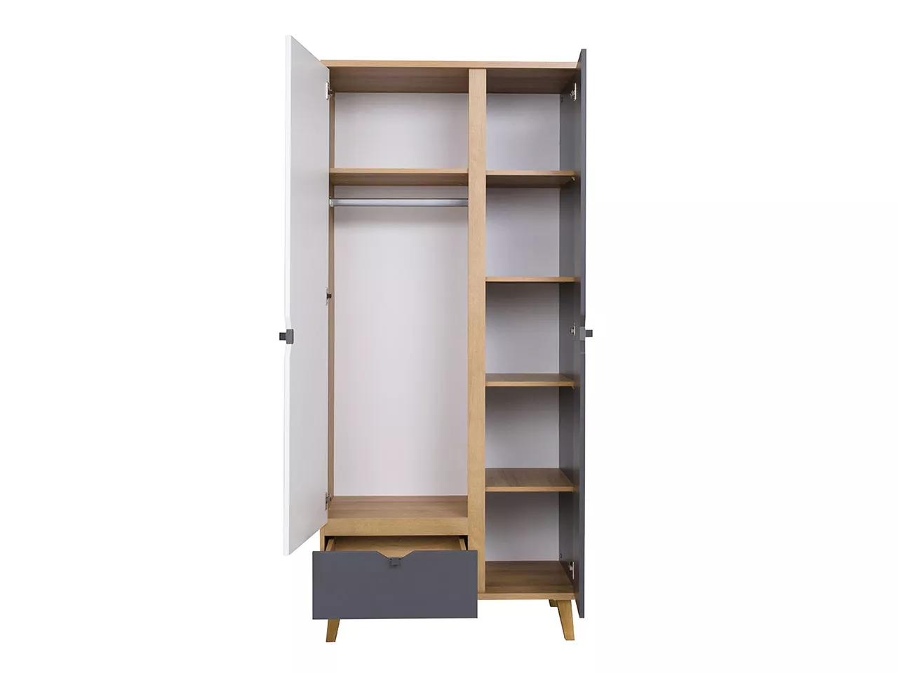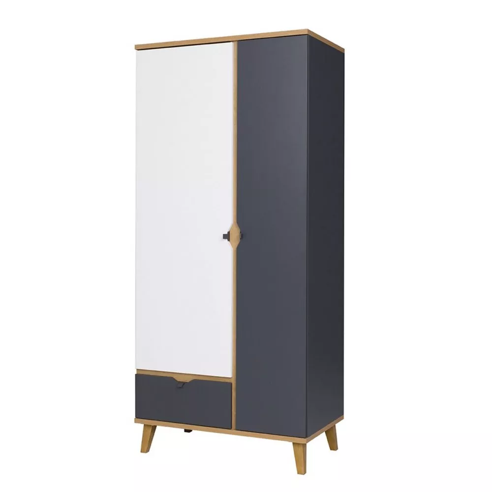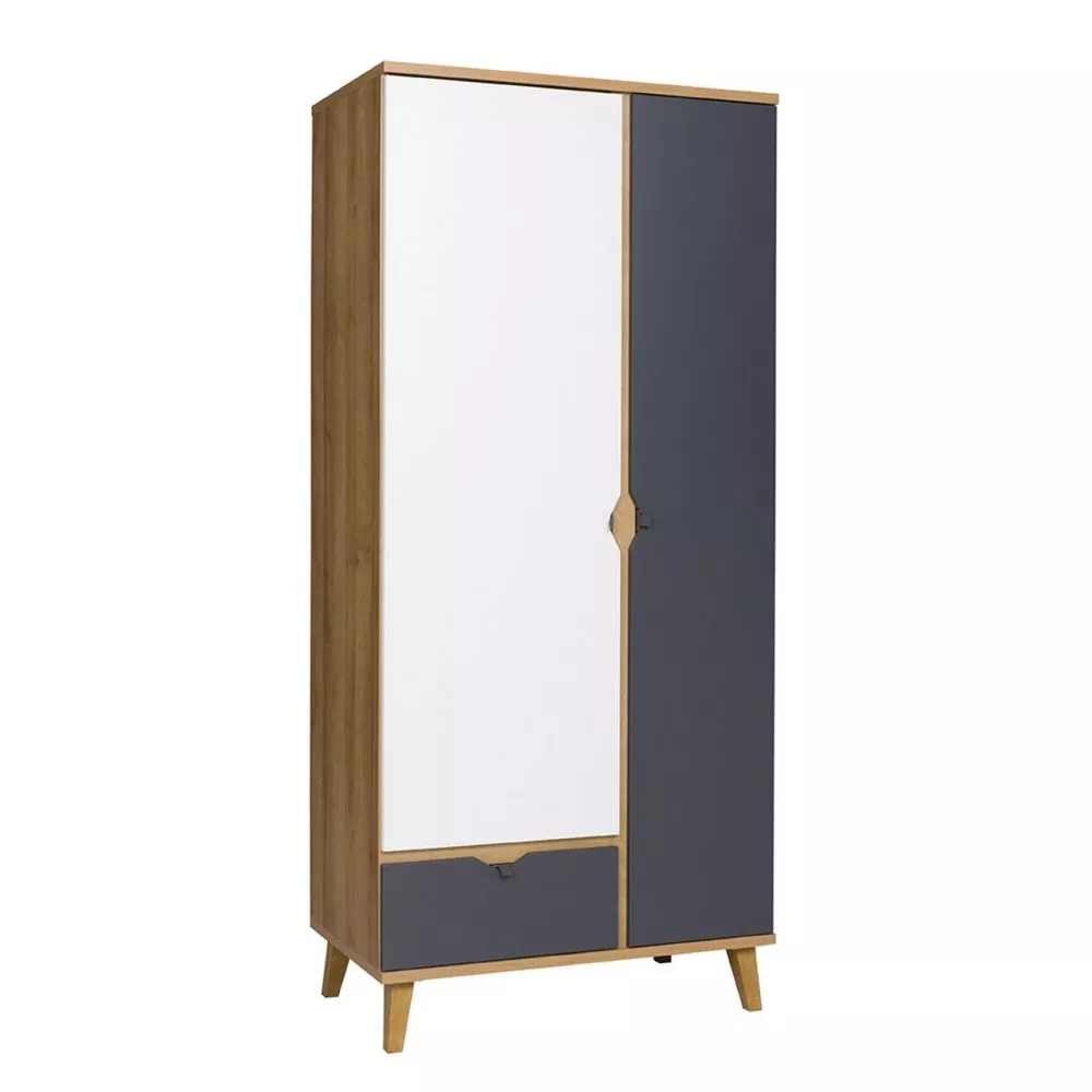 Prostorná a elegantní šatní skříň VISTA se dodává v univerzálních barvách, které dokonale ladí se skandinávským interiérem. Dvoudveřová skříň je vybavena šatní tyčí, hlubokými policemi a prostornou zásuvkou. Skříň je vyrobena z vysoce kvalitní LTD s ABS hranami.