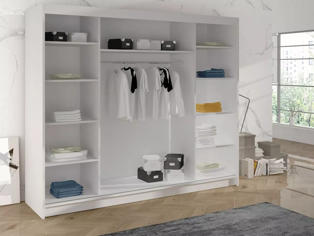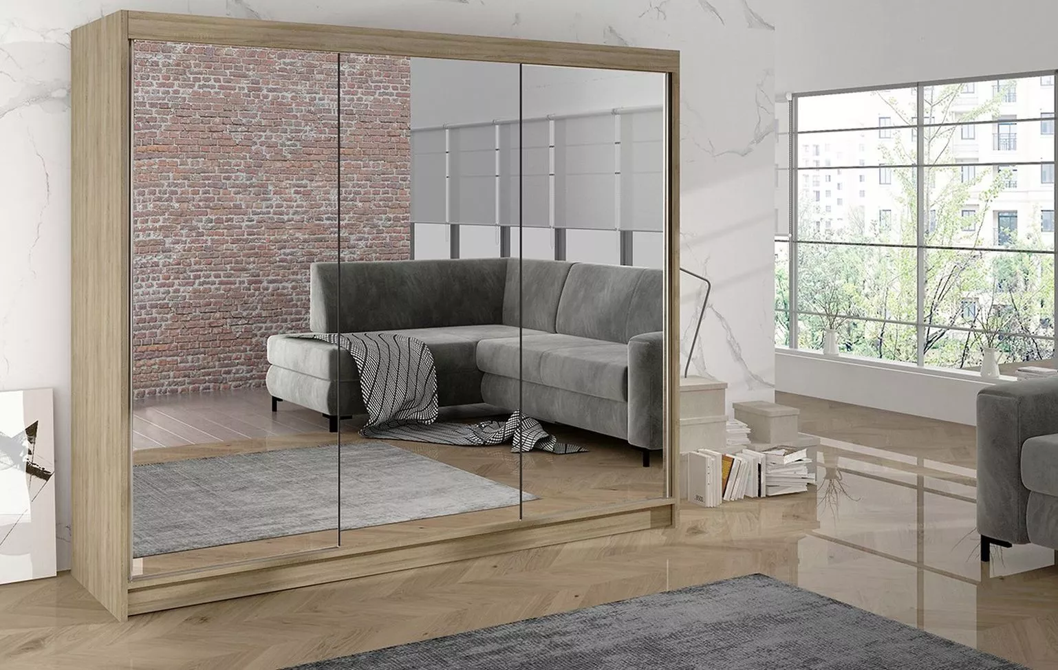 Skříň se zrcadlovými posuvnými dveřmi Daniella je vyrobena z kvalitního LTD o síle 16 mm. Vnitřek skříně vytváří dostatek úložného prostoru v podobě šatní tyče i polic. Šatník zakryjí praktické posuvné dveře.