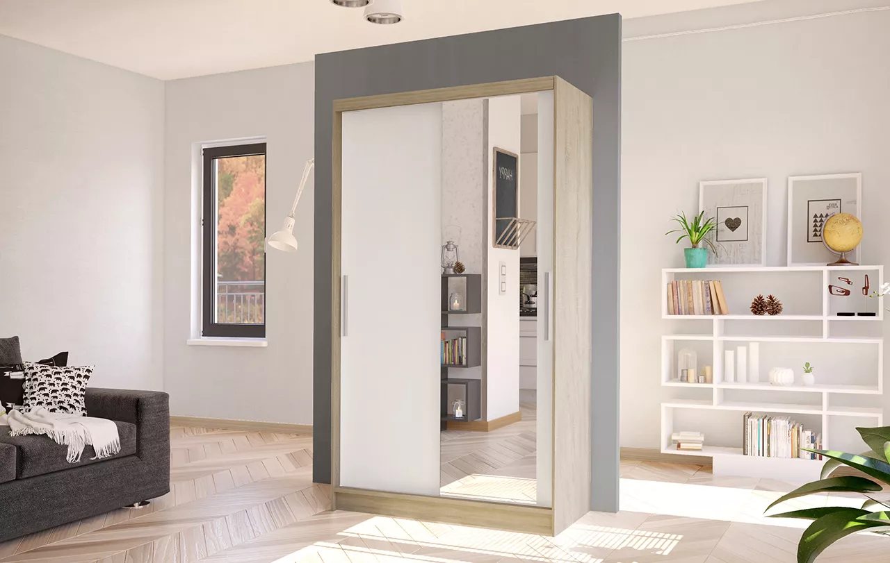 Šatní skříň BRUNO 6 nabízí velkorysý úložný prostor pro vaše oblečení. Díky vnitřnímu uspořádání budete moci vše uložit tak, aby každý kus oděvu měl své místo a vy jej v případě potřeby snadno našli. Zrcadlo umístěné na posuvných dveřích vám prosvětlí interiér a opticky zvětší prostor.