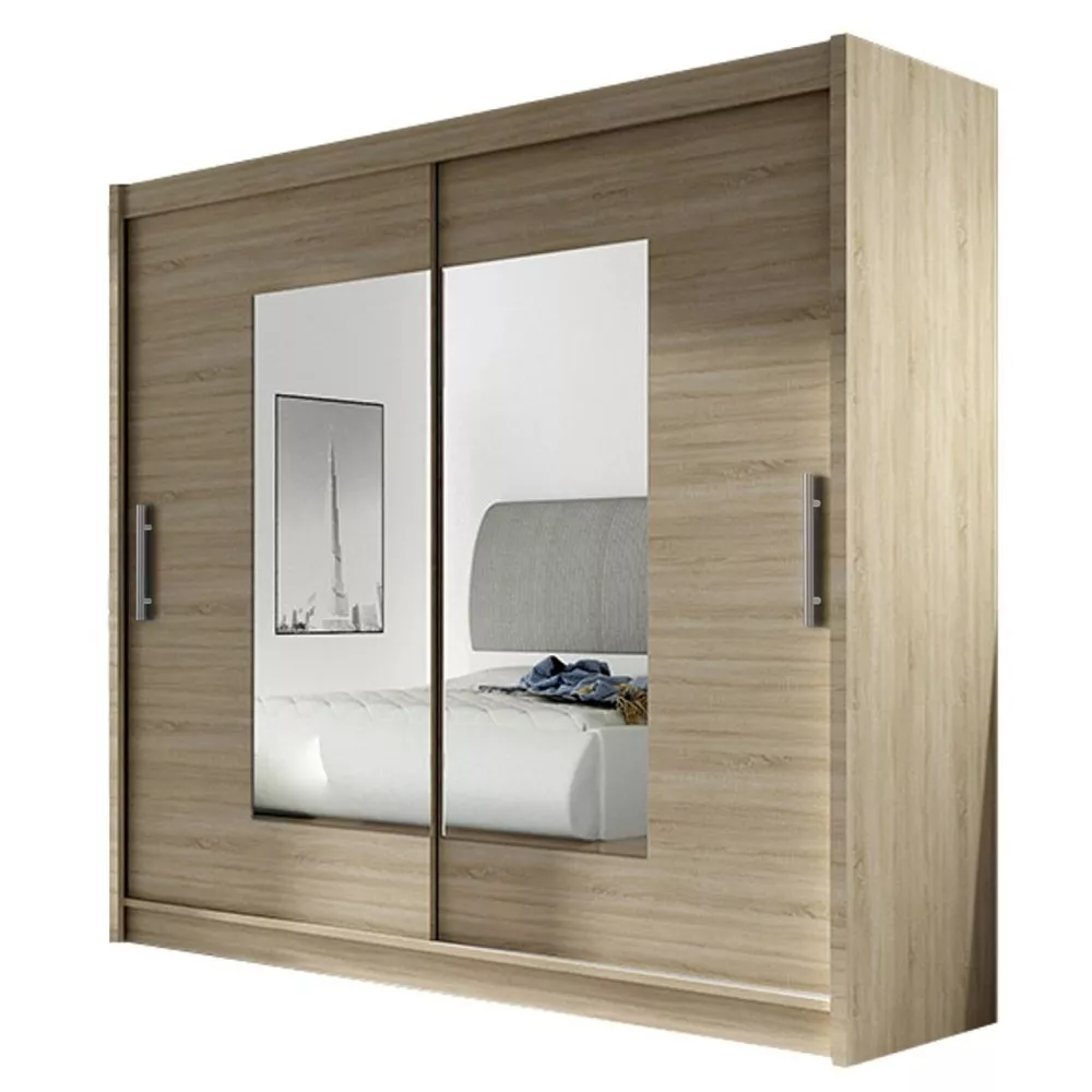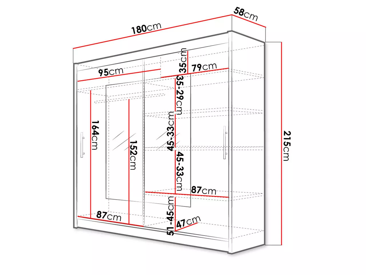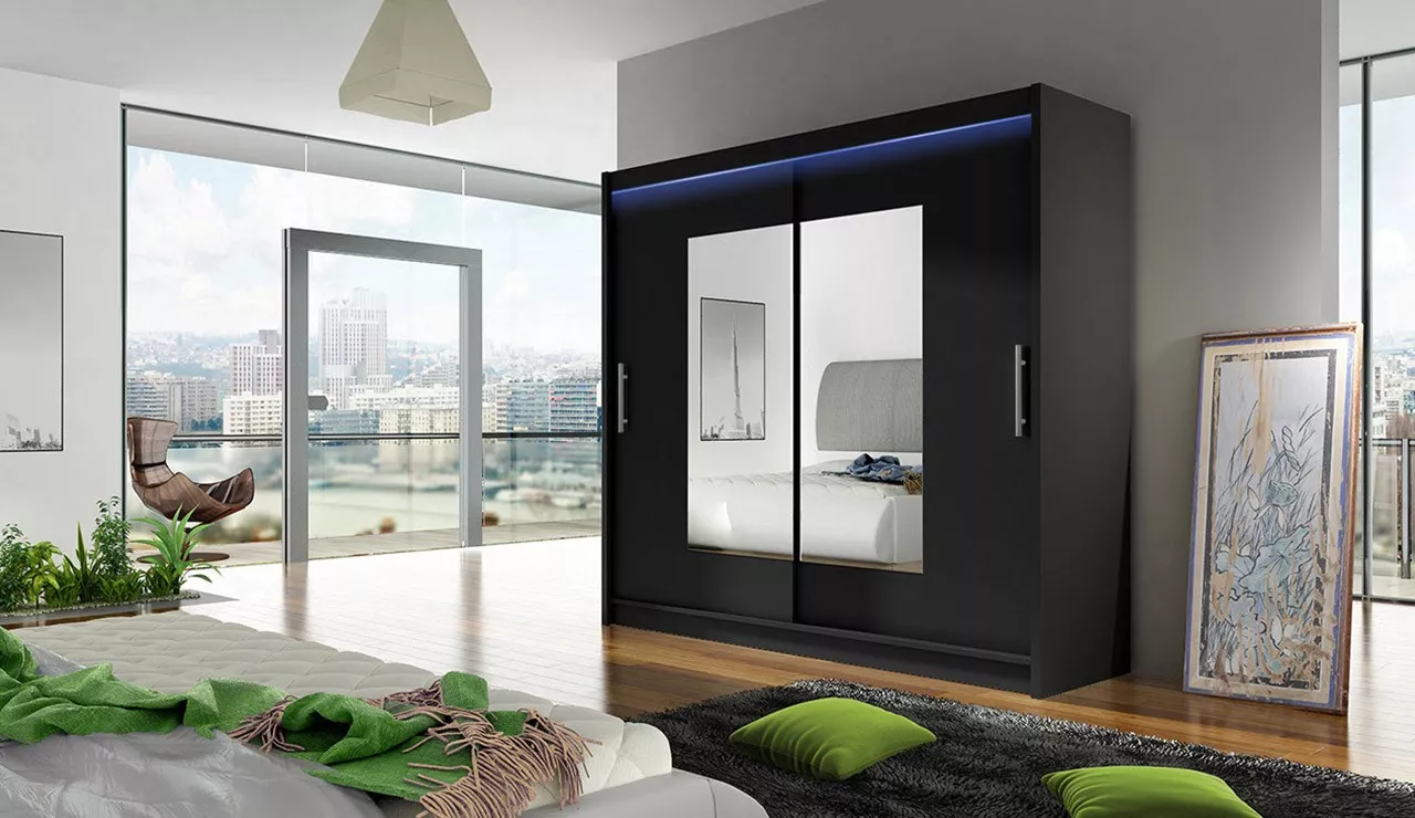 Šatní skříň se zrcadlem a LED osvětlením FLORENCIO 7 se hodí do každého moderního interiéru. Vnitřní uspořádání je tvořeno hlubokými policemi a šatní tyčí, které umožňují snadné oddělení každodenních věcí. Systém posuvných dveří zaručuje snadné a jednoduché ovládání dveří. Skříň je vybavena inovativním RGB LED osvětlením, které nabízí výběr mezi 15 barevnými variantami. LED osvětlení se ovládá pomocí přiloženého dálkového ovládání.