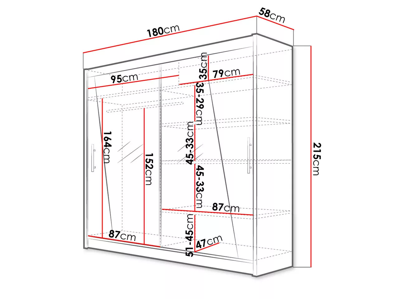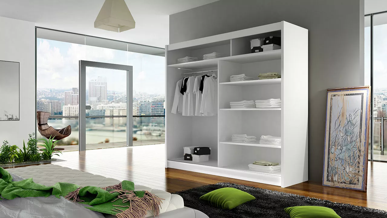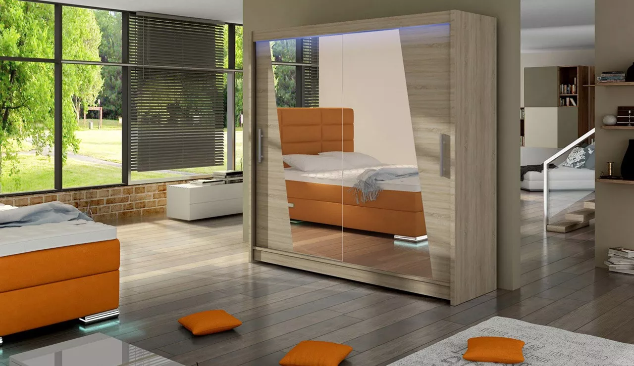 Šatní skříň se zrcadlem a LED osvětlením FLORENCIO 14 se hodí do každého moderního interiéru. Vnitřní uspořádání je tvořeno hlubokými policemi a šatní tyčí, které umožňují snadné oddělení každodenních věcí. Systém posuvných dveří zaručuje snadné a jednoduché ovládání dveří. Skříň je vybavena inovativním RGB LED osvětlením, které nabízí výběr mezi 15 barevnými variantami. LED osvětlení se ovládá pomocí přiloženého dálkového ovládání.