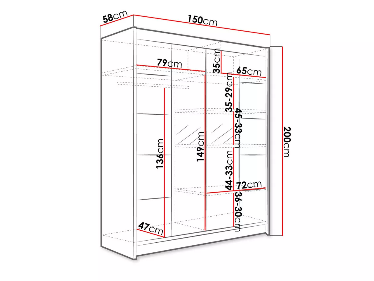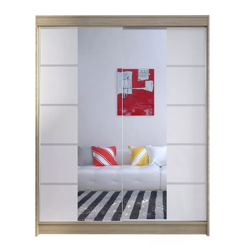Kombinovaná šatní skříň s posuvnými dveřmi a LED osvětlením PIRITU 5 může být doplňkem každé ložnice nebo předsíně. Vnitřní uspořádání je tvořeno hlubokými policemi a šatní tyčí, které umožňují snadné oddělení každodenních věcí. Skříň je vybavena RGB LED osvětlením. Na výběr je mezi 15 barevnými variantami, které se přepínají pomocí přiloženého dálkového ovládání. Zrcadlo dodává šatníku kouzlo a zvětšuje a osvětluje místnost, ve které bude skříň umístěna. Konstrukce skříně je vyrobena z vysoce kvalitní LTD desky, jejíž hrany byly zesíleny PVC dýhou, což zaručuje vysokou kvalitu. Systém posuvných dveří funguje hladce a plynule. Hliníkové úchyty na posuvných dveřích zdůrazňují moderní styl, zvyšují funkčnost šatníku a brání ohýbání dveří.