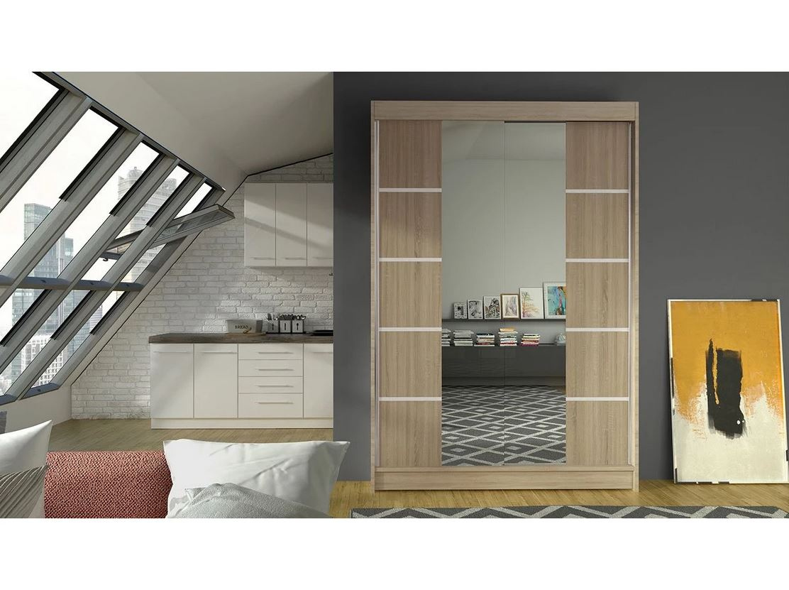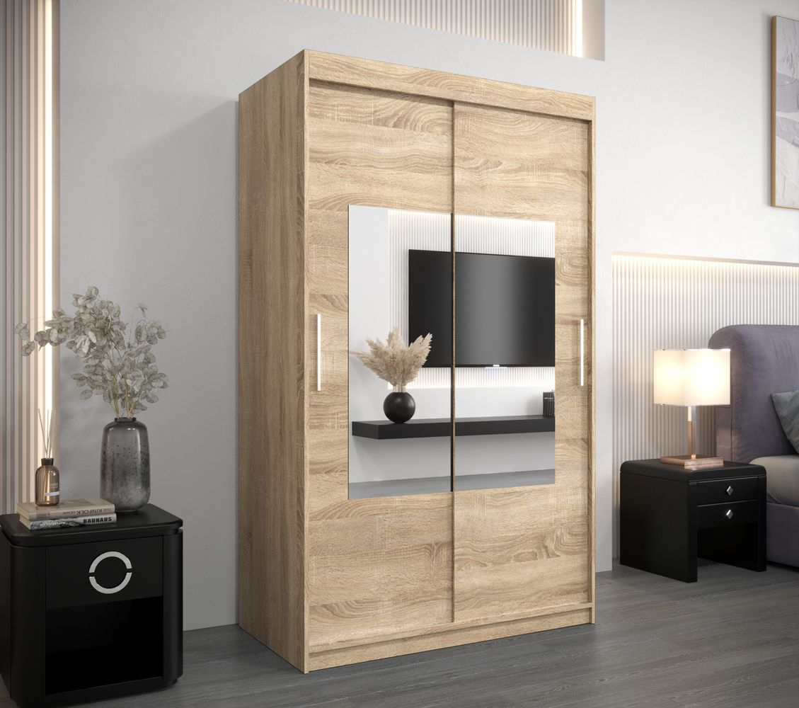 Posuvná šatní skříň 120 cm se zrcadlem a LED RGB osvětlením SAMANRE 5 - dub sonoma
