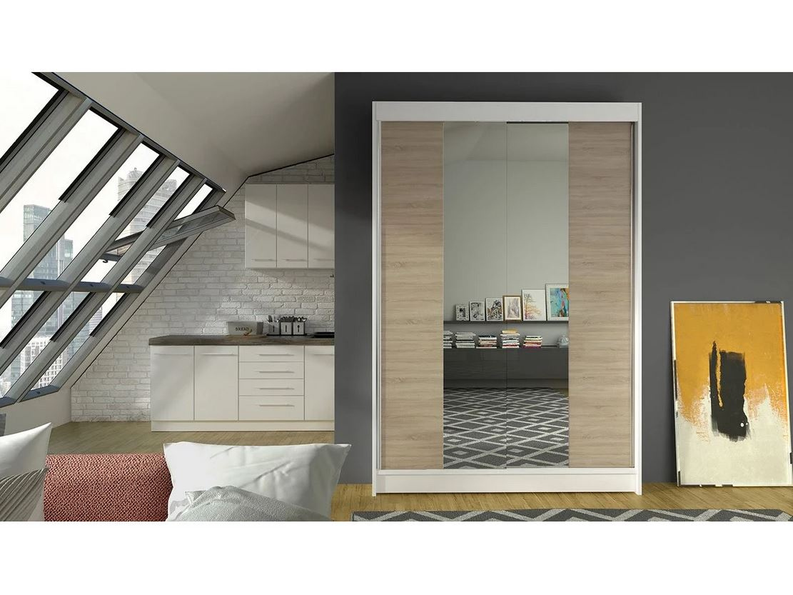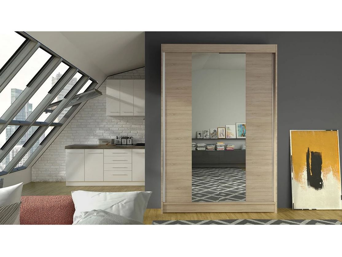Šatní skříň se zrcadlem a LED RGB osvětlením SAMANRE 5 může být doplňkem každé ložnice nebo předsíně. Vnitřní uspořádání je tvořeno hlubokými policemi a šatní tyčí, které umožňují snadné oddělení každodenních věcí. Skříň je vybavena RGB LED osvětlením. Na výběr je mezi 15 barevnými variantami, které se přepínají pomocí přiloženého dálkového ovládání. Zrcadlo, které je umístěno uprostřed, dodává šatníku kouzlo, zatímco zvětšuje a osvětluje místnost, ve které bude skříň umístěna. Konstrukce skříně je vyrobena z vysoce kvalitní LTD desky, jejíž hrany byly zesíleny ABS dýhou, což zaručuje vysokou kvalitu. Systém posuvných dveří funguje hladce a plynule. Důvodem jsou hliníkové vodící lišty a úchyt ve formě hliníkových pásků.