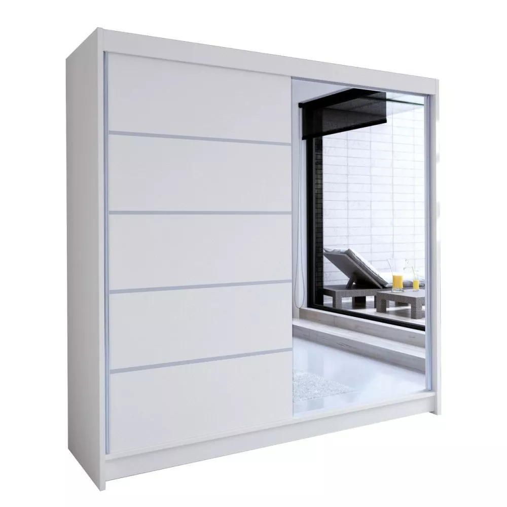Šatní skříň se zrcadlem a posuvnými dveřmi VILMA 3 se hodí do každého moderního interiéru. Vnitřní uspořádání je tvořeno hlubokými policemi a šatní tyčí, které umožňují snadné oddělení každodenních věcí. Skříň je vybavena barevným RGB LED osvětlením, které vám usnadní hledání vašeho perfektního kousku oblečení. Na výběr je mezi 15 barevnými variantami, které se přepínají pomocí přiloženého dálkového ovládání. Zrcadlo dodává šatníku kouzlo, zatímco zvětšuje a osvětluje místnost, ve které bude skříň umístěna. Skříň je vyrobena z odolné LTD desky, jejíž okraje jsou zakončeny dýhou PVC, což zvyšuje odolnost a trvanlivost nábytku.
