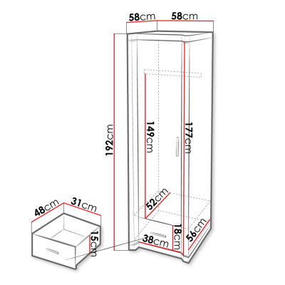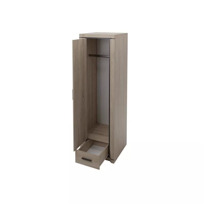 Šatní skříň ARIKA může být doplňkem každé ložnice nebo předsíně. Skříň je vybavena tyčí na ramínka a zásuvkou, která je umístěna ve spodní části. Kvalitní komponenty, zejména LTD deska, zajišťují stabilitu a životnost skříňky.