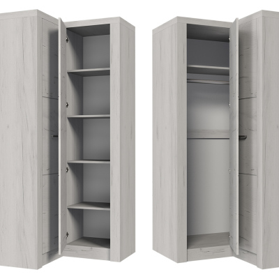 Rohová šatní skříň CHALAPATA 1 může být doplňkem každé ložnice nebo předsíně. Vnitřní uspořádání je tvořeno hlubokými policemi a šatní tyčí, které umožňují snadné oddělení každodenních věcí. CHALAPATA 1 je model, který zaujme svým elegantním vzhledem. Čelní strany jsou vyrobeny z textury imitující přírodní dřevo. Ozdobným detailem skříně jsou kovové úchytky.