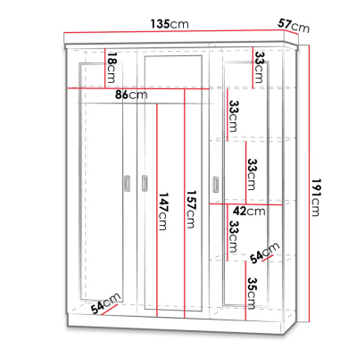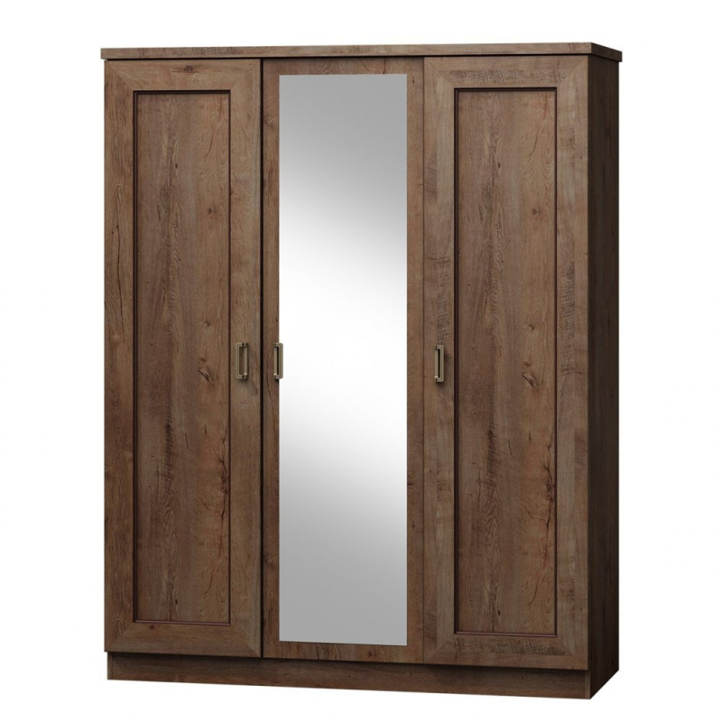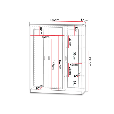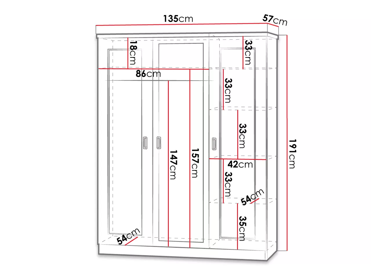 Třídveřová šatní skříň MERLO je pokladem v každé šatně nebo ložnici. Tlumené barvy čel v souhře s úsporným designem se hodí ke klasickému i rustikálnímu uspořádání místností. Vnitřní uspořádání je tvořeno hlubokými policemi a šatní tyčí, které umožňují snadné oddělení každodenních věcí. Díky zrcadlu umístěném ve středu skříně bude celý interiér o něco větší. Zrcadlo je praktickým doplňkem, abyste si mohli zkontrolovat svůj outfit.