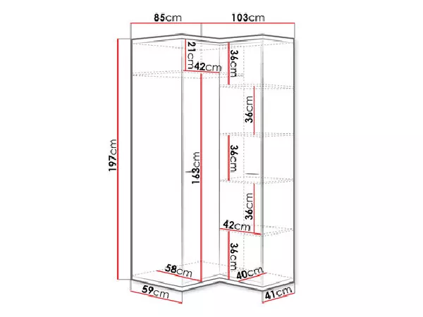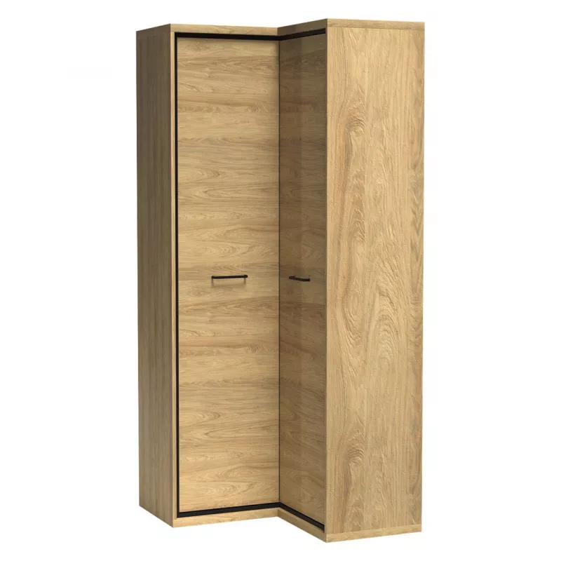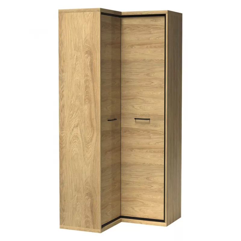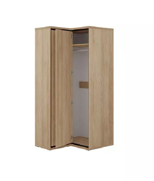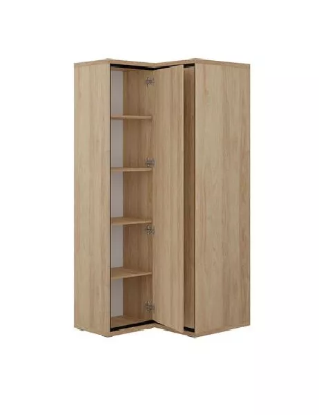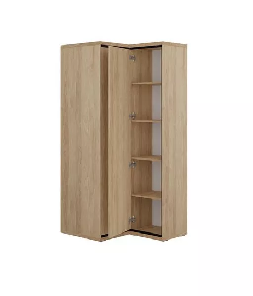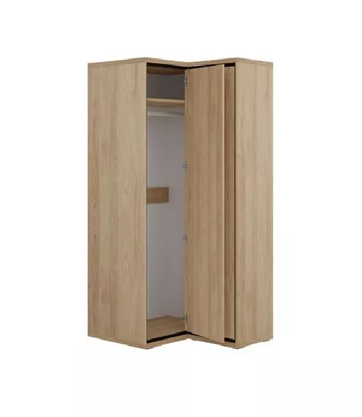 Rohová šatní skříň SUCRE 3 se nejlépe hodí do multifunkčních nebo malých místností. Uvnitř rohové šatní skříně naleznete prostorné police, které vám pomohou uspořádat věci a závěsnou tyč na oblečení. Skříň je vyrobena z pevných materiálů a její barevné provedení se hodí téměř do každého interiéru.