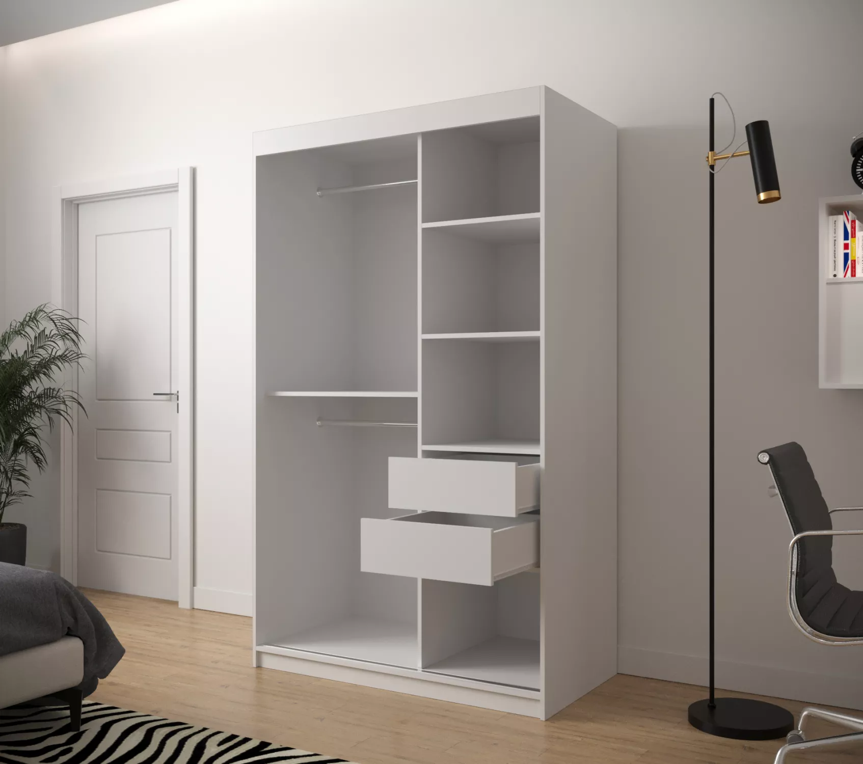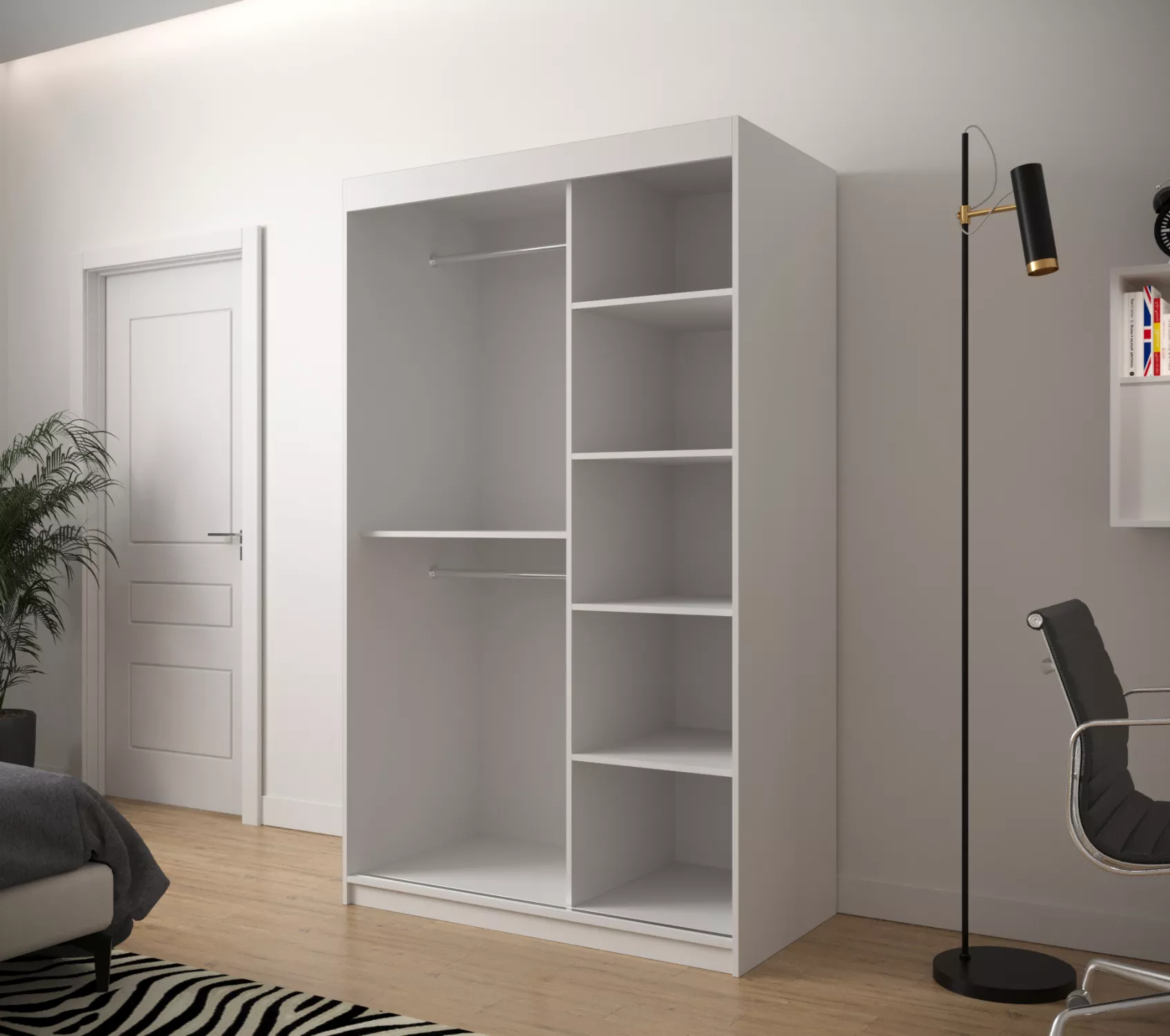 Posuvná šatní skříň Janette zaujme svým moderním designem. Je vyrobena z kvalitního LTD, které je opatřeno PVC hranami. Ty chrání LTD před mechanickým poškozením. Úložný prostor je složen z několika polic a dvou šatních tyčí.