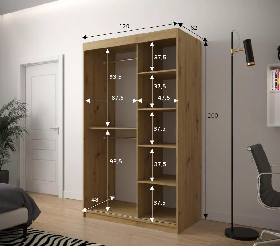 Šatní skříň s grafikou JANETTE 1 - šířka 120 cm, bílá / dub artisan / černá