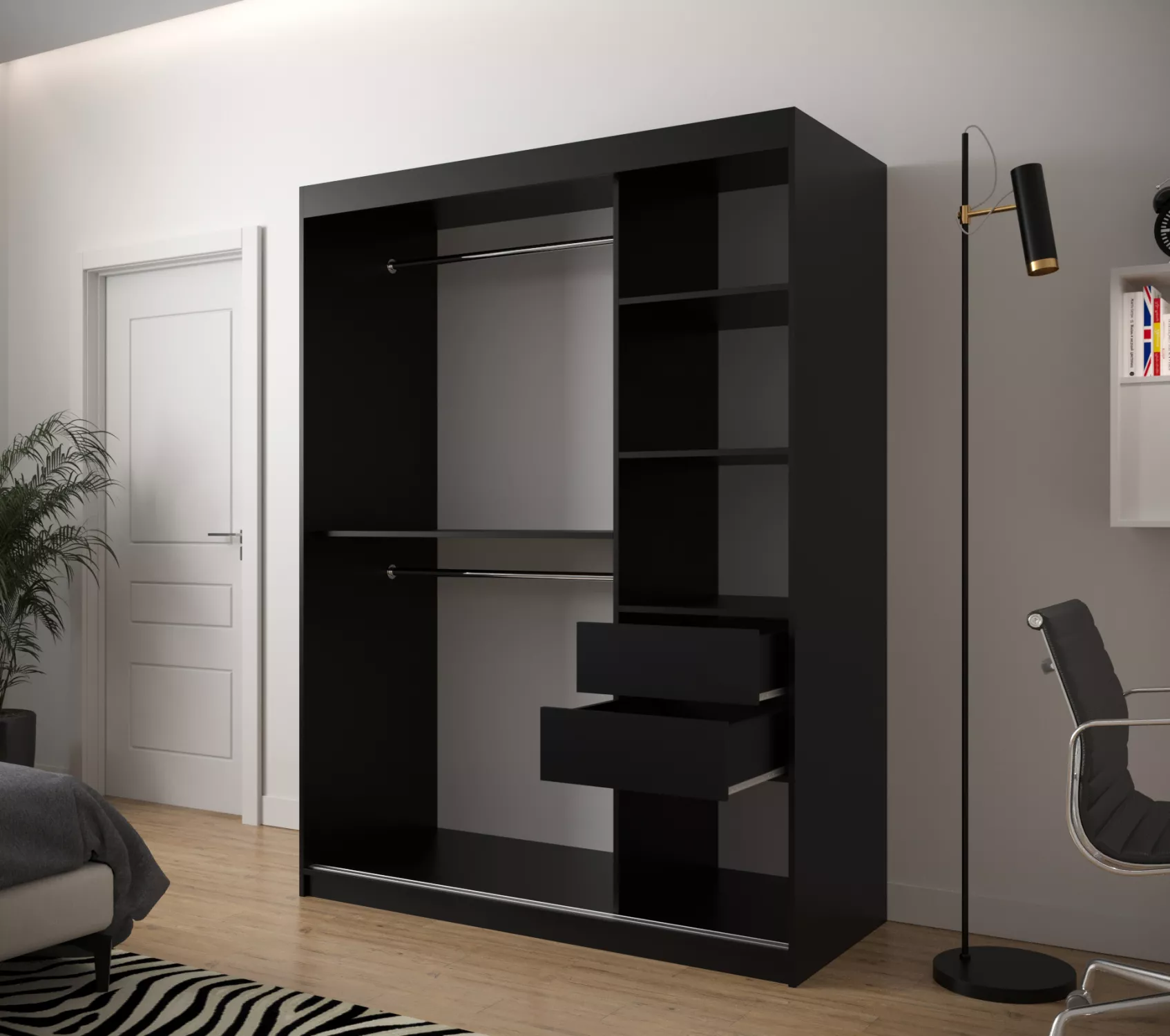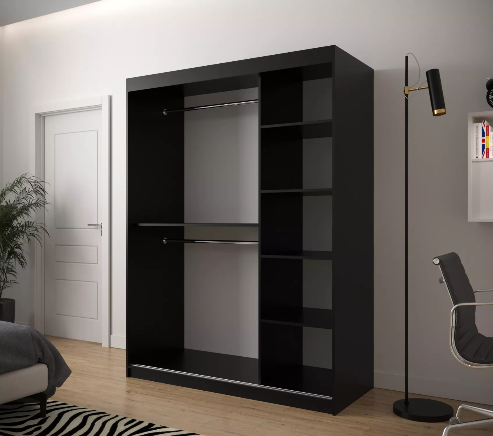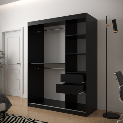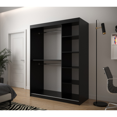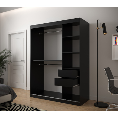 Posuvná šatní skříň Janette zaujme svým moderním designem. Je vyrobena z kvalitního LTD, které je opatřeno PVC hranami. Ty chrání LTD před mechanickým poškozením. Úložný prostor je složen z několika polic a dvou šatních tyčí.