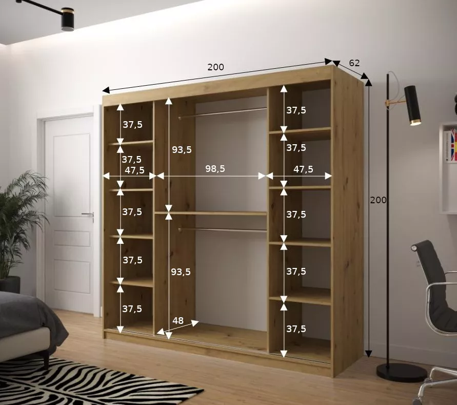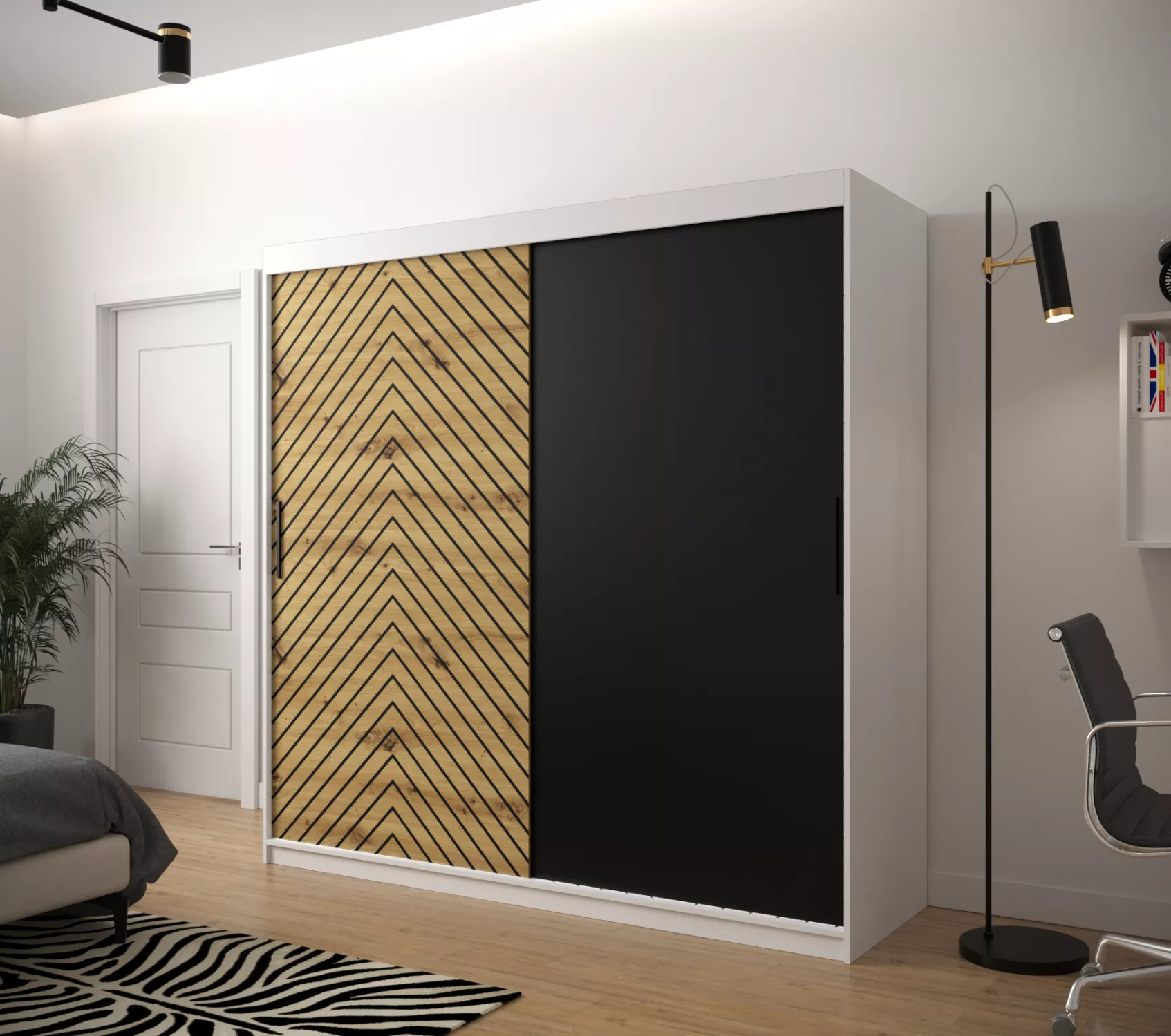Šatní skříň s grafikou JANETTE 1 - šířka 200 cm, bílá / dub artisan / černá