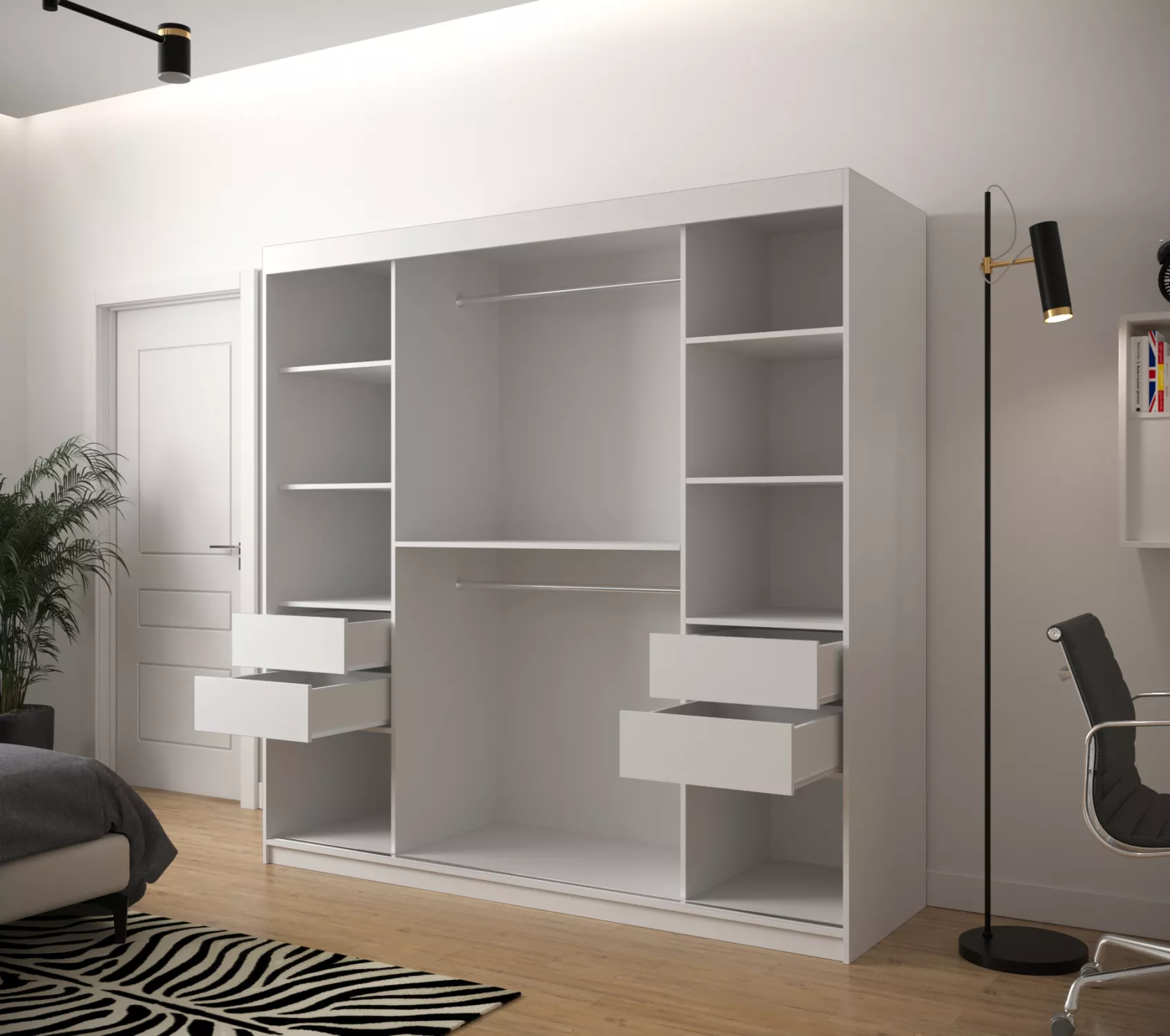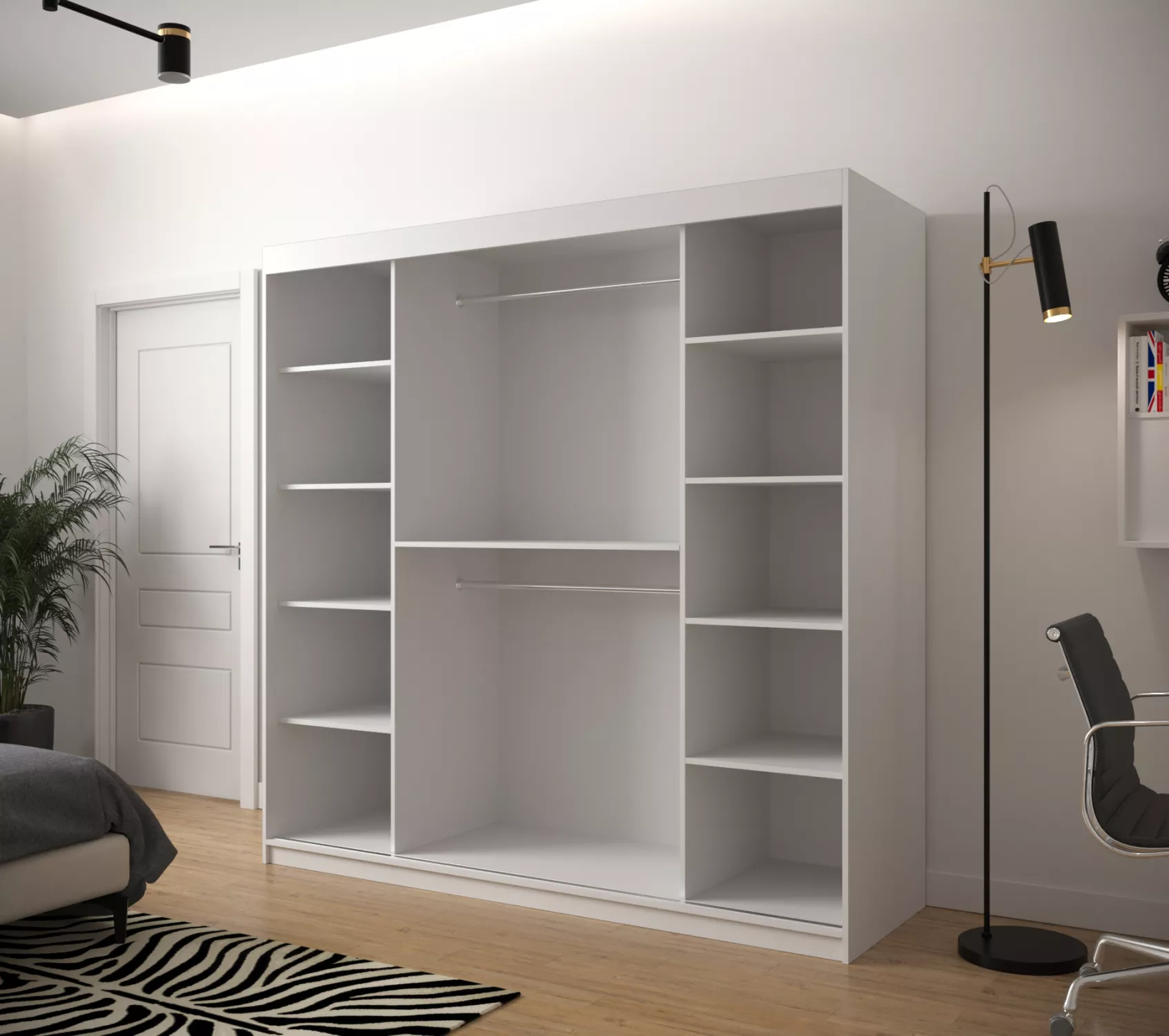 Posuvná šatní skříň Janette zaujme svým moderním designem. Je vyrobena z kvalitního LTD, které je opatřeno PVC hranami. Ty chrání LTD před mechanickým poškozením. Úložný prostor je složen z několika polic a dvou šatních tyčí.