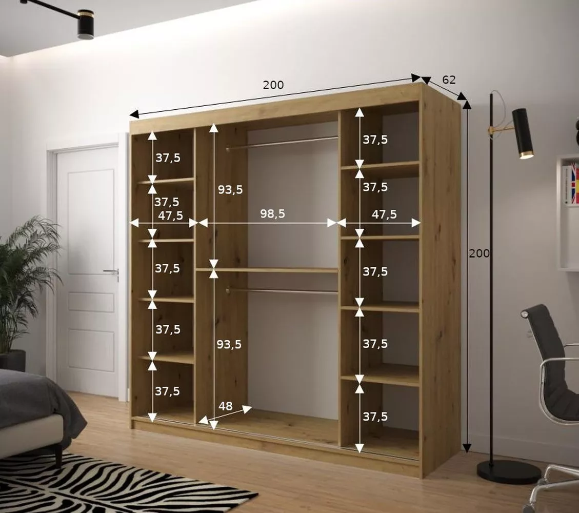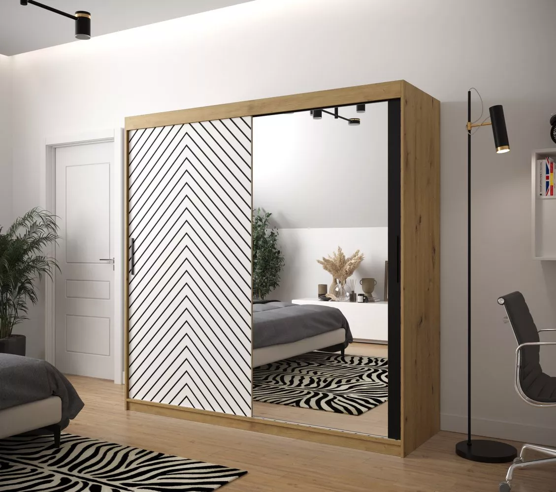 Skříň s grafikou a zrcadlem JANETTE 3 - šířka 200 cm, dub artisan / bílá