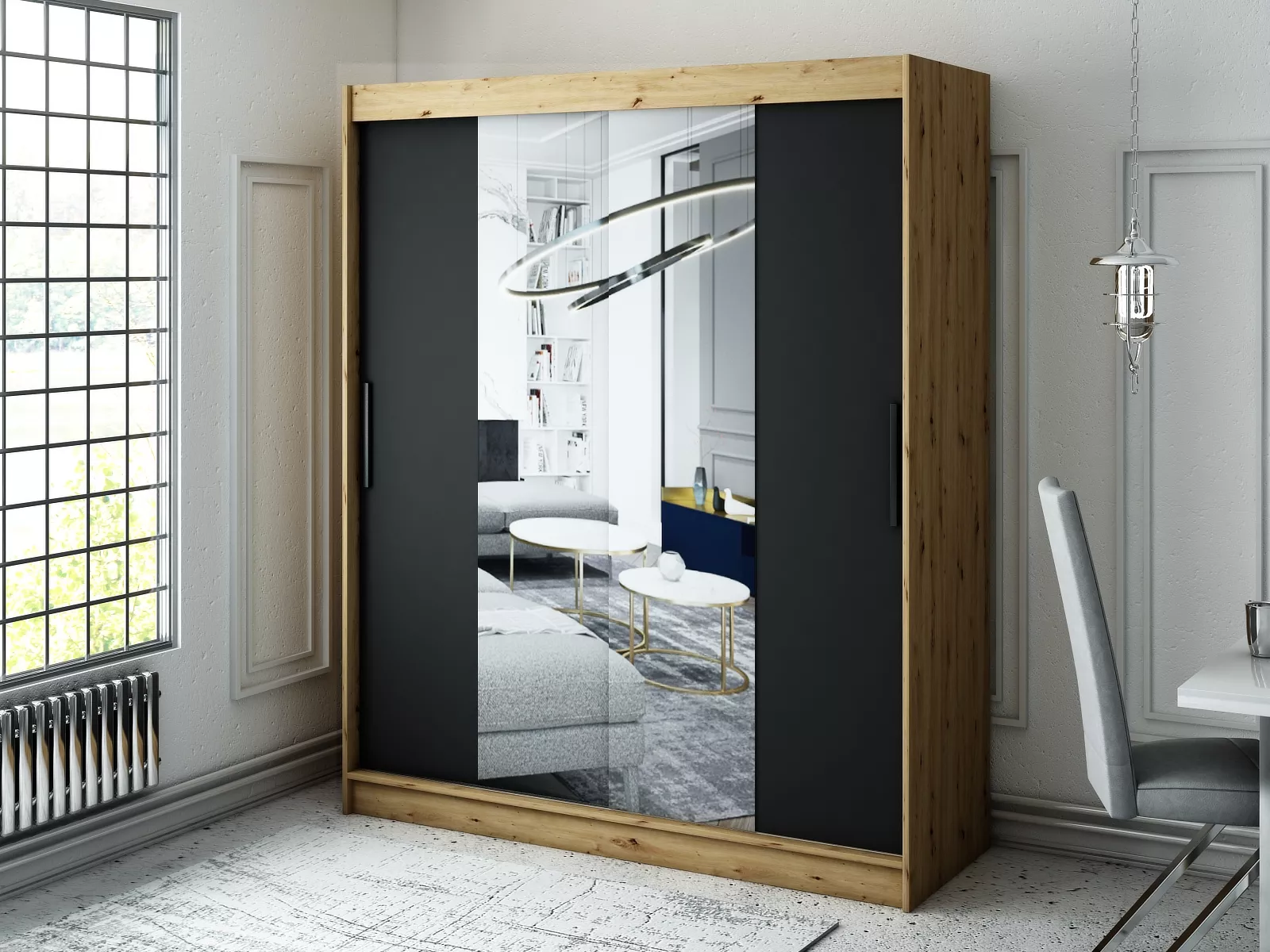 Šatní skříň s posuvnými dveřmi LURDES 2 - šířka 180 cm, dub artisan / černá