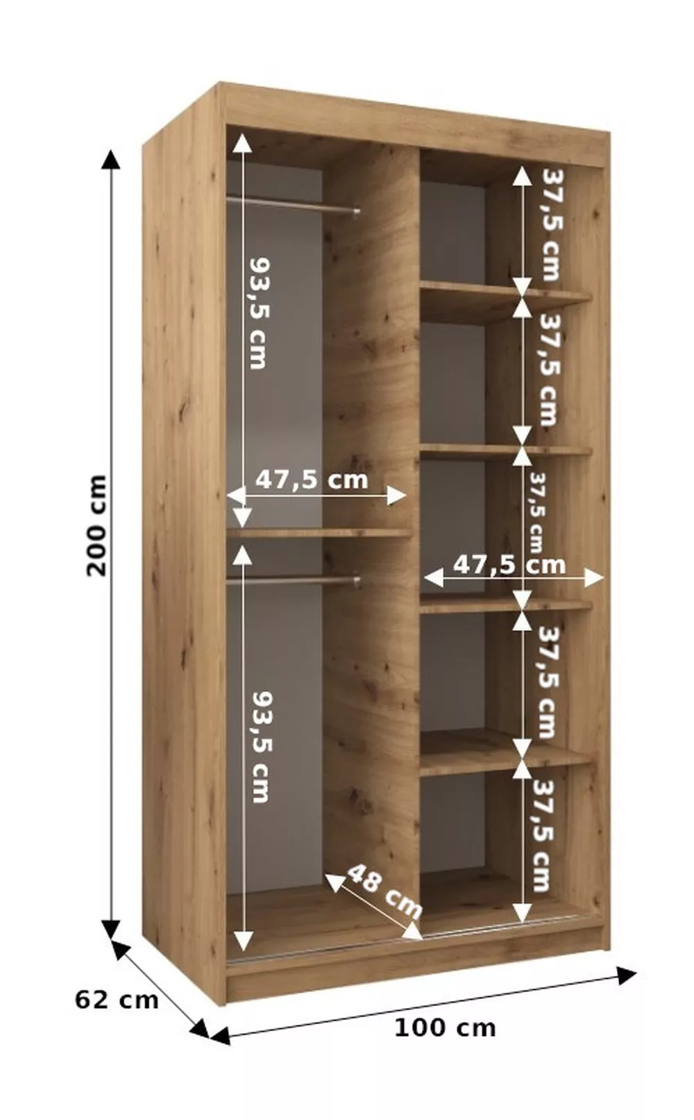 Velkorysé rozměry šatní skříně Enni vám napoví, že jste právě vyřešili problém s nedostatkem místa pro své oblečení. Za 2 posuvnými dveřmi se po pravé straně ukrývají police. Levá část je věnována prostoru se 2 šatními tyčemi a je v polovině rozdělená policí.