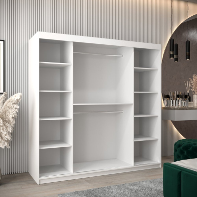 Velkorysé rozměry šatní skříně Enni vám napoví, že jste právě vyřešili problém s nedostatkem místa pro své oblečení. Za 2 posuvnými dveřmi se po pravé a levé straně ukrývají police. Prostřední část je věnována prostoru se 2 šatními tyčemi a je v polovině rozdělená policí.