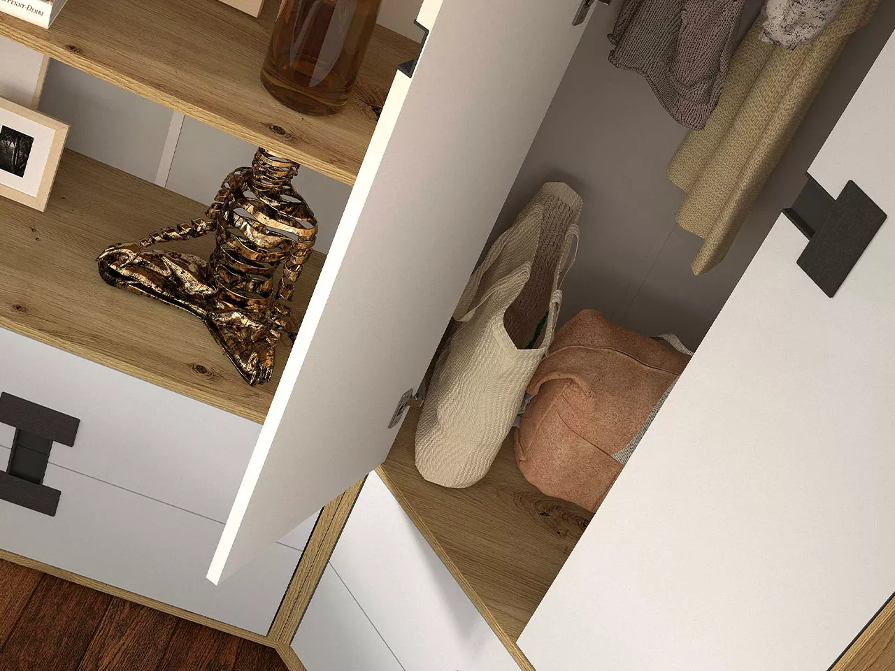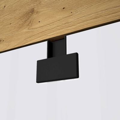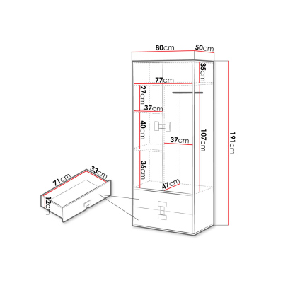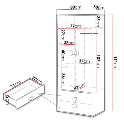 Dvoudveřová šatní skříň BASHIRA se vyznačuje moderním designem. Vnitřní uspořádání nabízí úložný prostor v podobě několik hlubokých polic a šatní tyče. Spodní část tvoří zásuvky, které umožňují plné vysunutí.